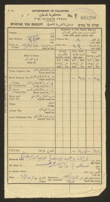 "وصل ضريبي"، صادر عن حكومة فلسطين من نمر يوسف، 5 أيار 1945