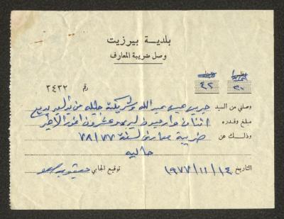 "A Receipt" by Birzeit Municipality for Jiries Abdullah and Jalila Abdullah, 14 November 1977