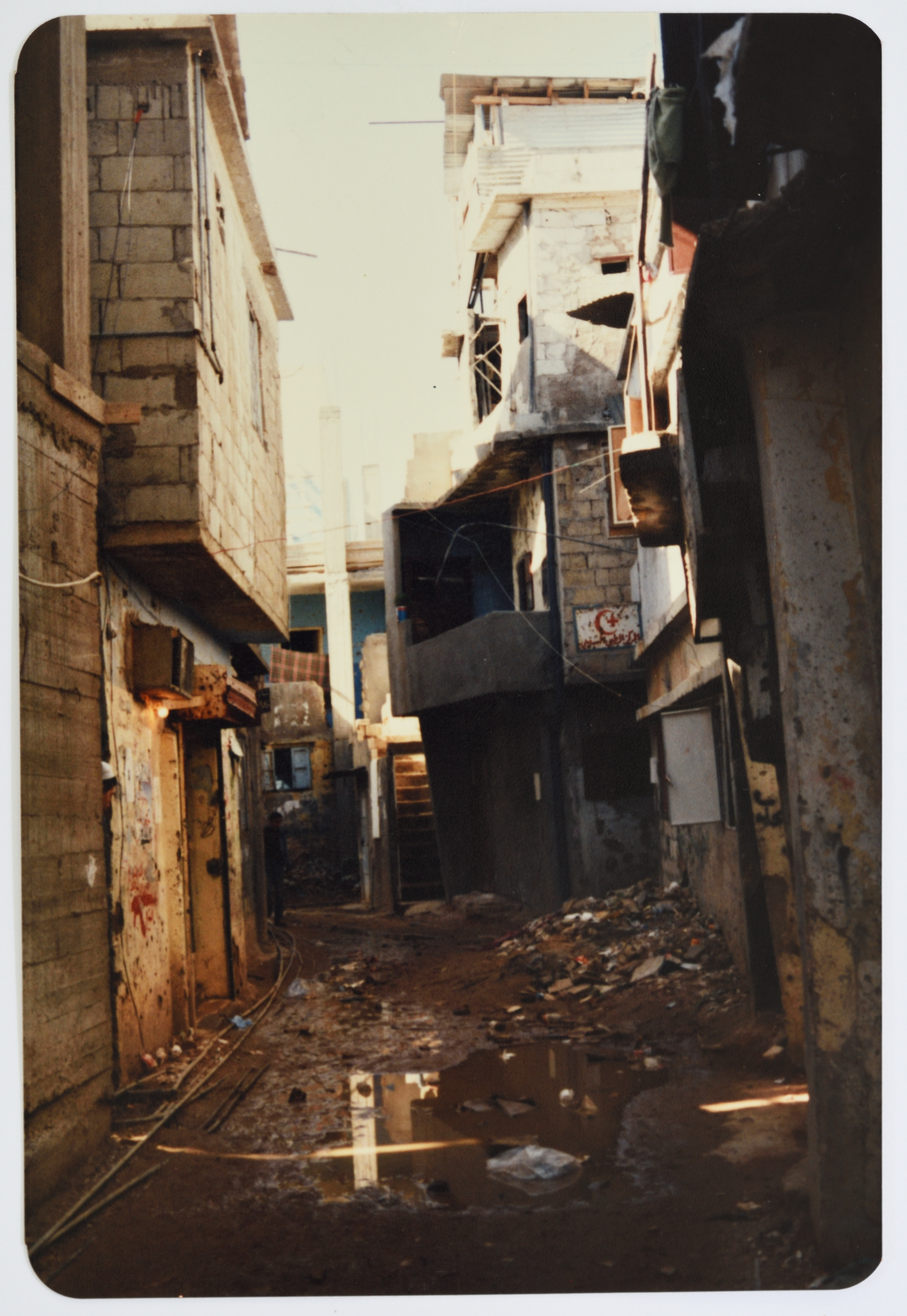 صورة لمشهد للدمار في أحد أزقة مخيم شاتيلا للاجئين الفلسطينيين في لبنان، خلال حرب المخيمات. والتُقطت الصورة ما بين عاميّ 1985 و1986.