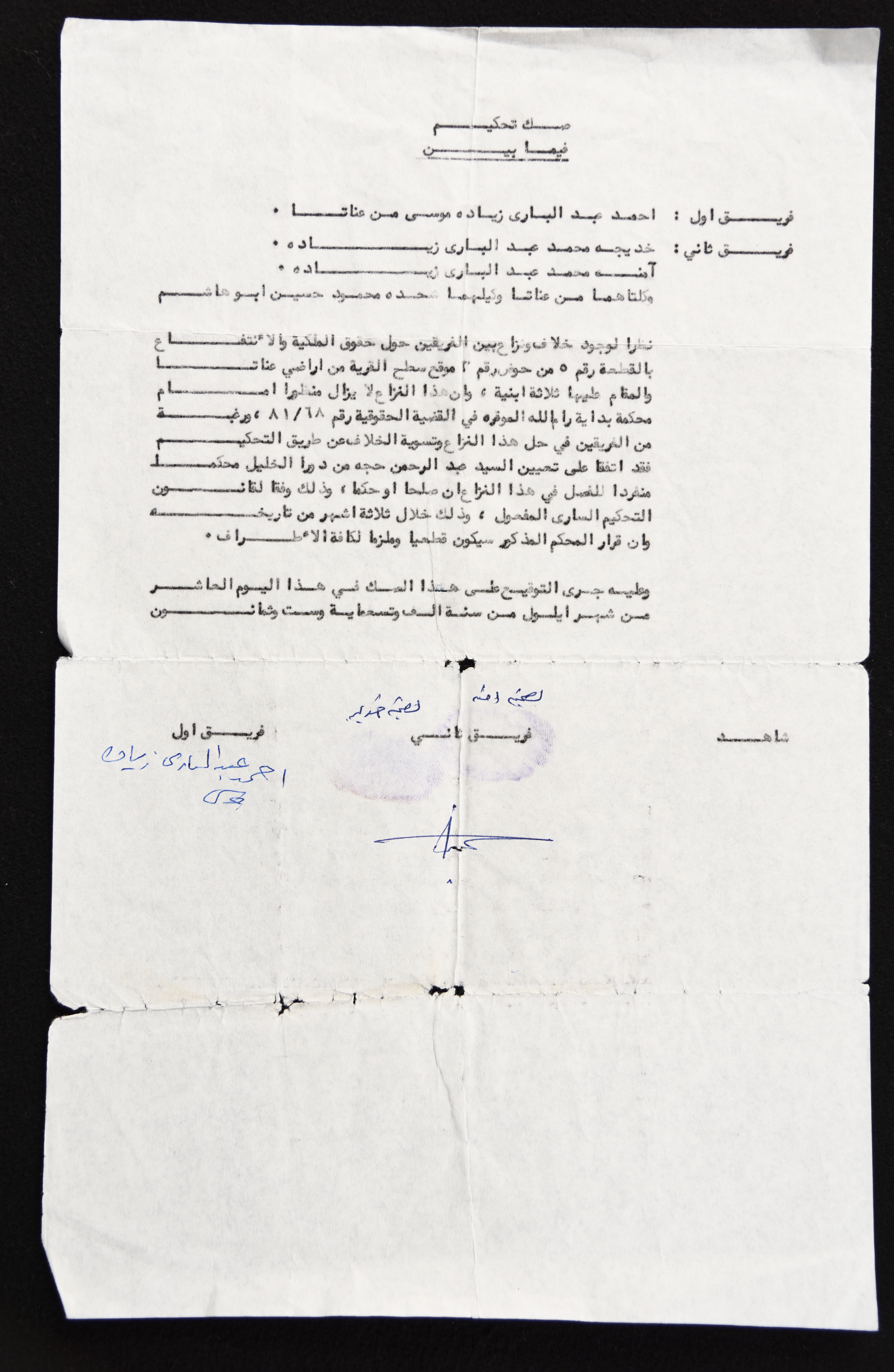 صك تحكيم بين فريقين من عائلة زيادة من عناتا، على خلاف ونزاع حول حقوق الملكية والانتفاع من قطعة أرض في عناتا.