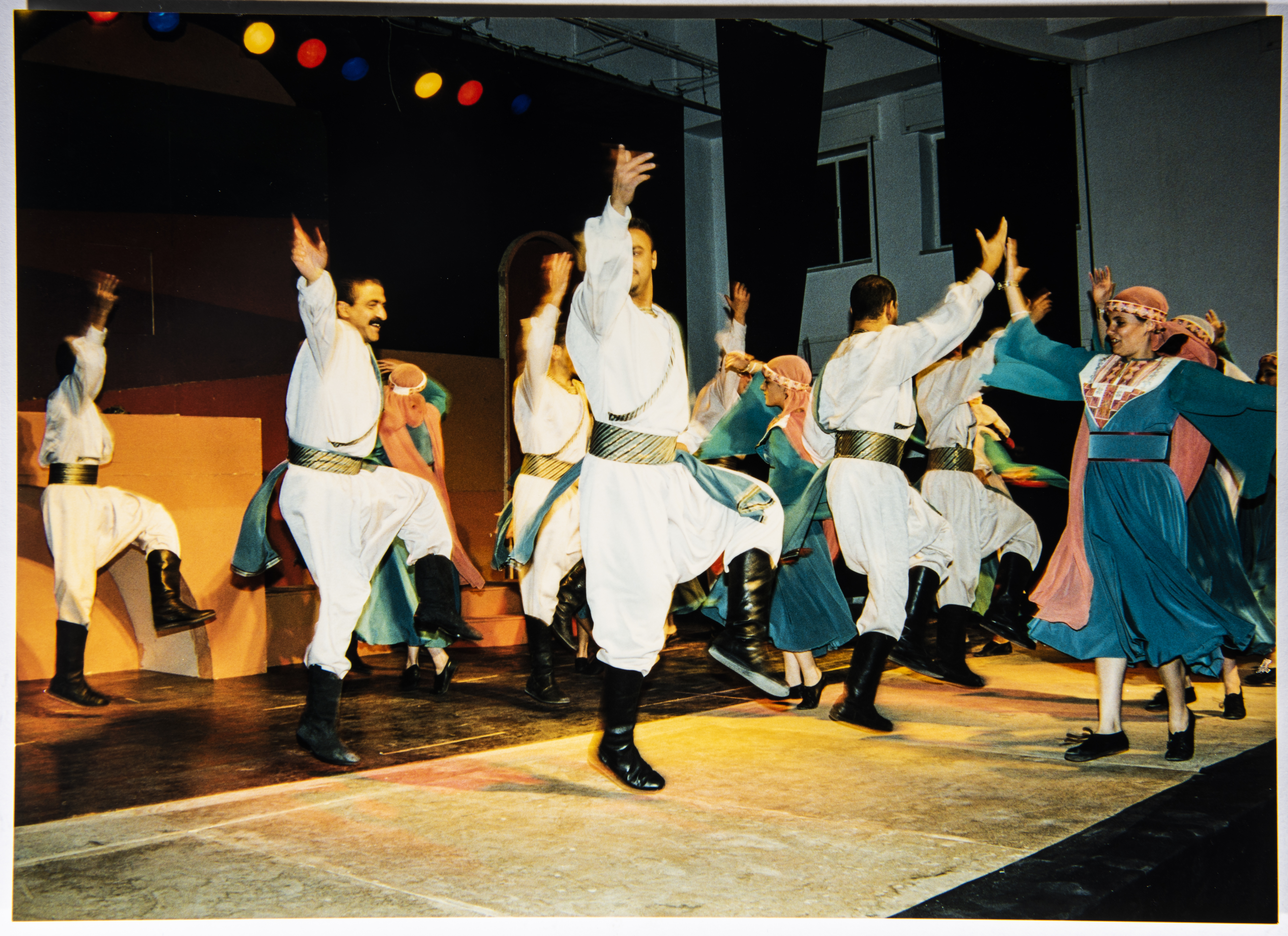 A colour photograph captures a glimpse of el-Funoun Palestinian Popular Dance Troupe's “Zaghareed” Dance Show in 1997.