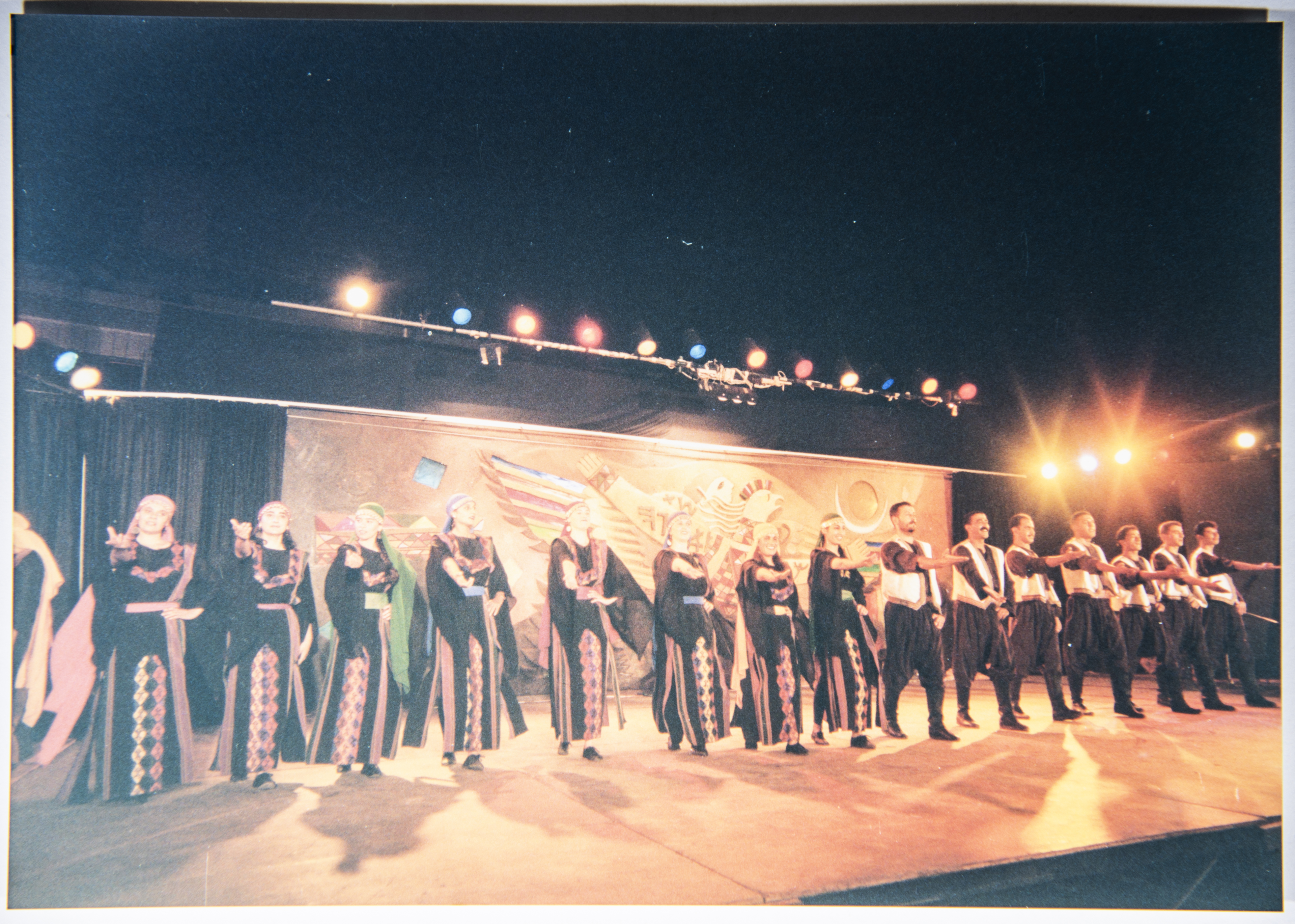 صورة ملونة ترصد ملمحًا من مشاركة فرقة الفنون الشعبيّة في مهرجان فلسطين الدولي عام 1996.