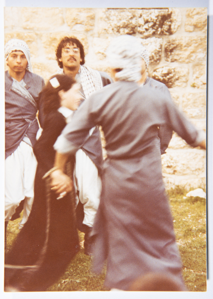 Taken in 1984, this colour photograph captures a freeze of el-Funoun Palestinian Popular Dance Troupe's dance show, "Wadi a-Tuffah" [apple valley].