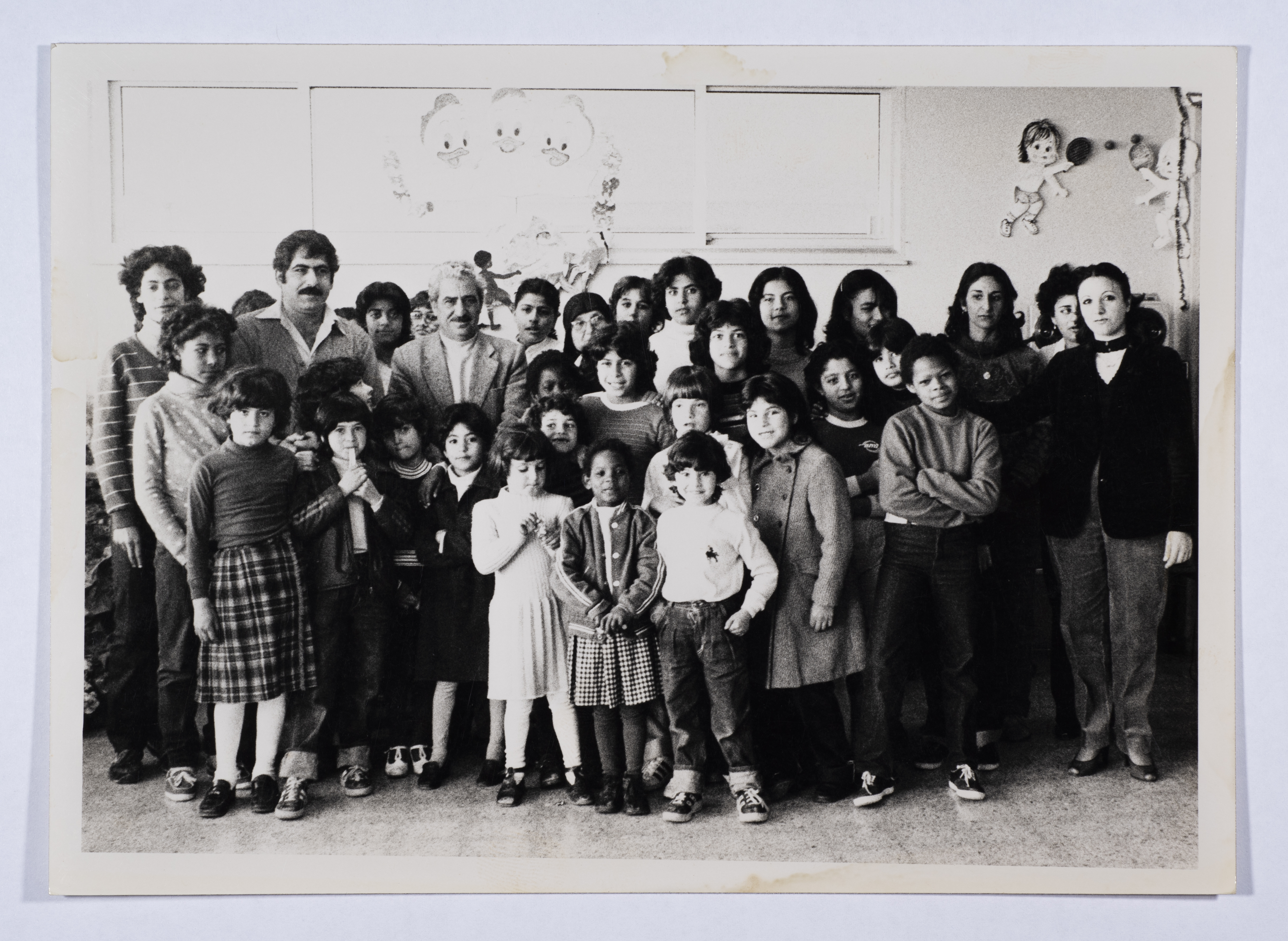 A black-and-white photograph showing Tawfiq Ziad on a visit to a school in Nazareth.