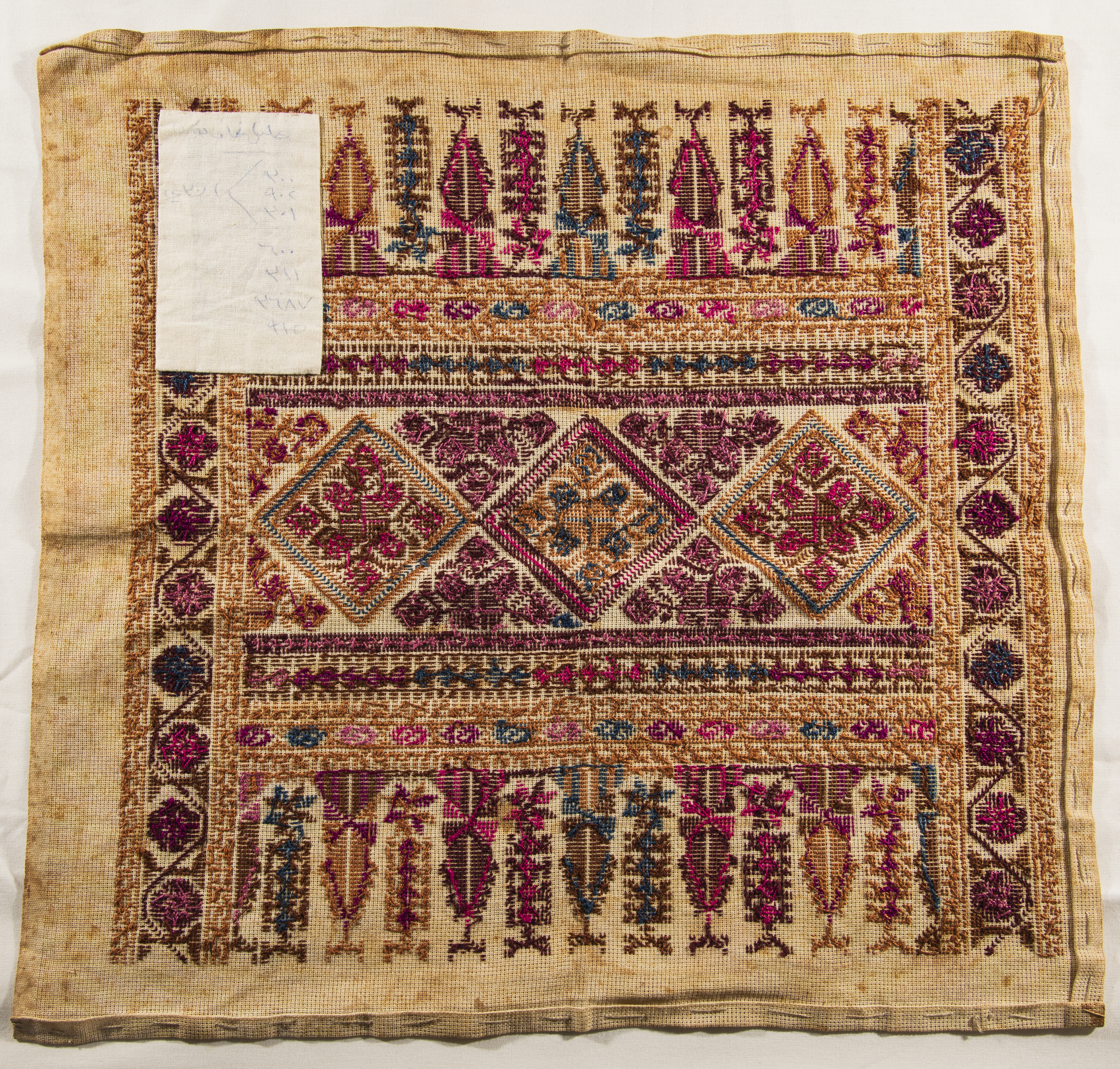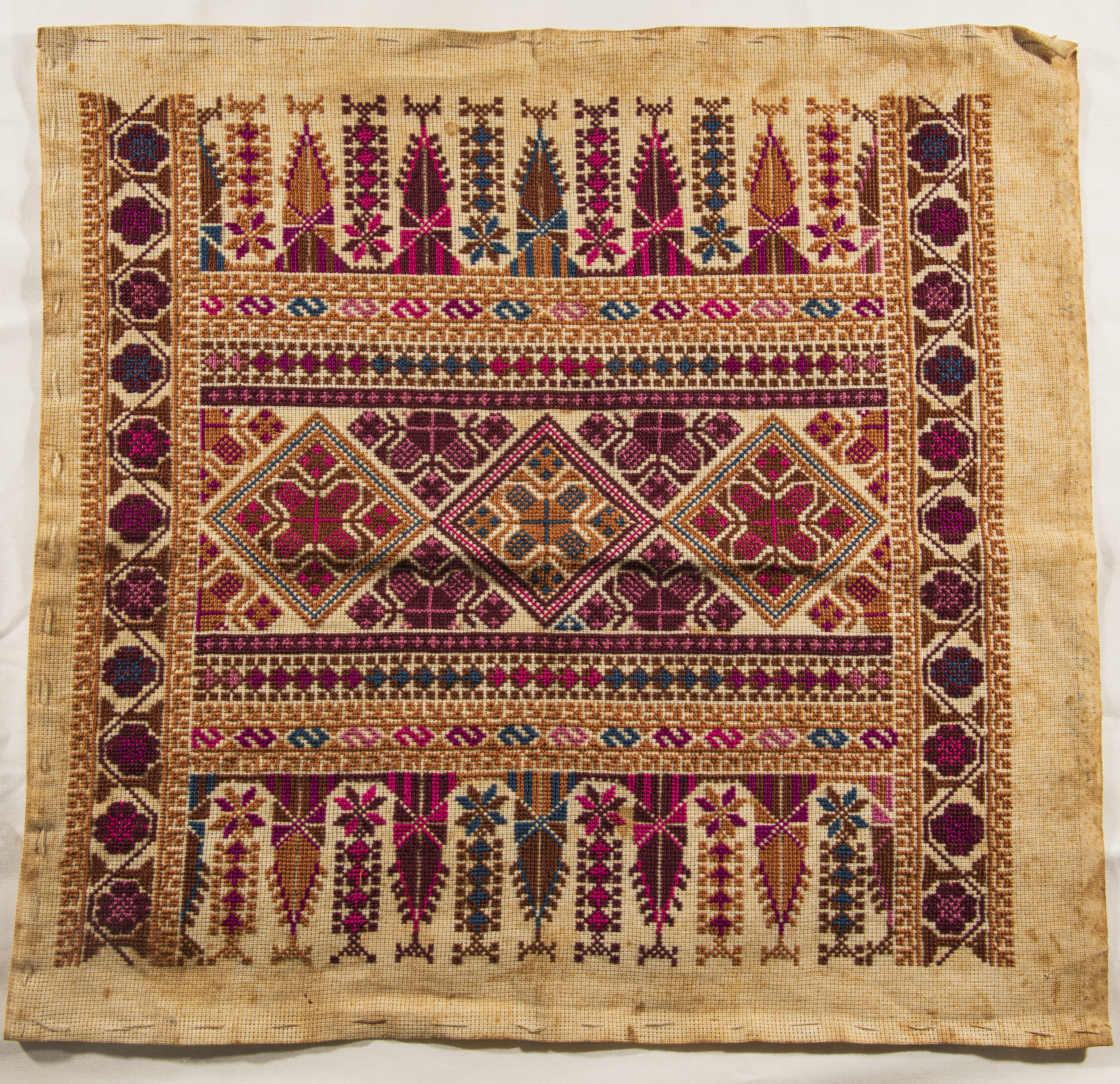 صورة تُظهر قطعة مُطرزة، أنتجتها نساء جمعية إنعاش المخيم الفلسطيني في لبنان خلال سبعينيات القرن العشرين، وقد تأسست الجمعية عام 1968 على يد هيكات الخوري ابنة بشارة الخوري، رئيس الجمهوريّة اللبنانيّة الأوّل بعد الاستقلال، ومجموعة من اللبنانيات بهدف كسر عزلة المخيمات الفلسطينية، وتمكين اللاجئات وإعانتهن، عقب أن أوصد القانون اللبناني باب سوق العمل في وجه أزواجهن، كما حظيت الجمعية، في مرحلة لاحقة، بدعم سيرين الحسيني وسيدات فلسطينيات أخريات.