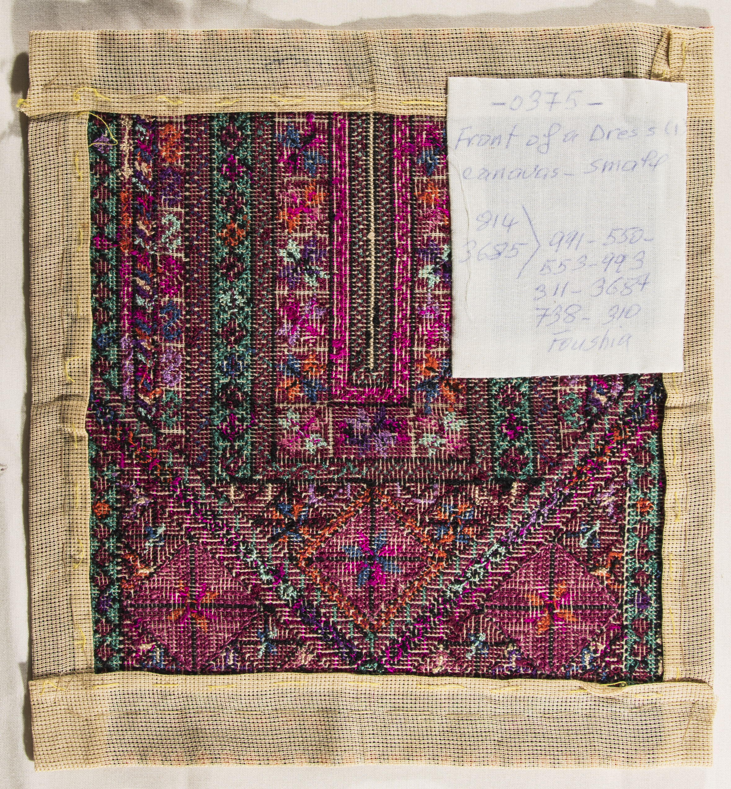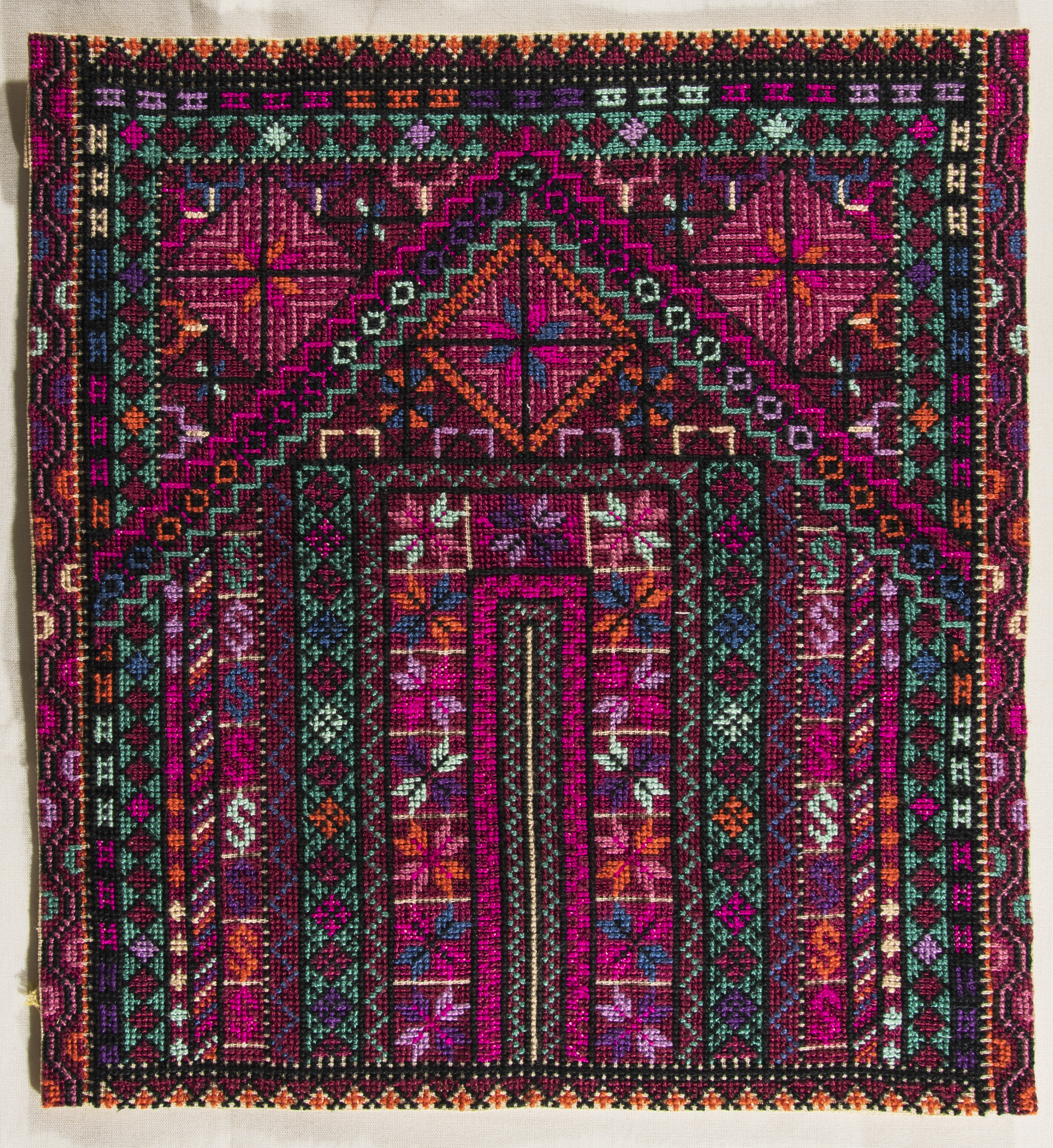 صورة تُظهر قطعة مُطرزة، أنتجتها نساء جمعية إنعاش المخيم الفلسطيني في لبنان خلال سبعينيات القرن العشرين، وقد تأسست الجمعية عام 1968 على يد هيكات الخوري ابنة بشارة الخوري، رئيس الجمهوريّة اللبنانيّة الأوّل بعد الاستقلال، ومجموعة من اللبنانيات بهدف كسر عزلة المخيمات الفلسطينية، وتمكين اللاجئات وإعانتهن، عقب أن أوصد القانون اللبناني باب سوق العمل في وجه أزواجهن، كما حظيت الجمعية، في مرحلة لاحقة، بدعم سيرين الحسيني وسيدات فلسطينيات أخريات.
