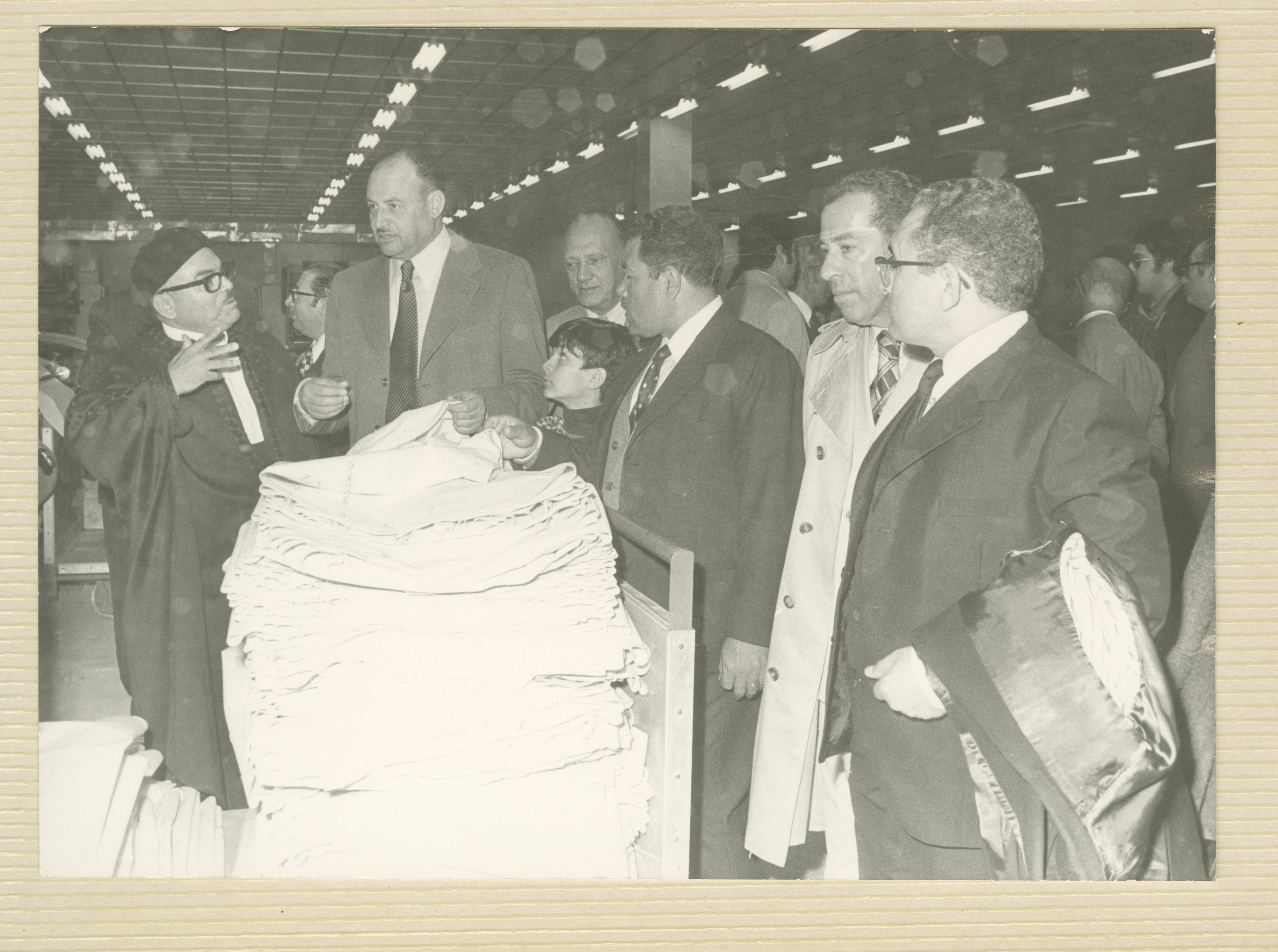 Taken during the period from 1971 to 1972, this photograph shows a part of the visit of a delegation of the Federation of Palestinian Bar Association, including Yasser Amro, to a textile factory in Libya.