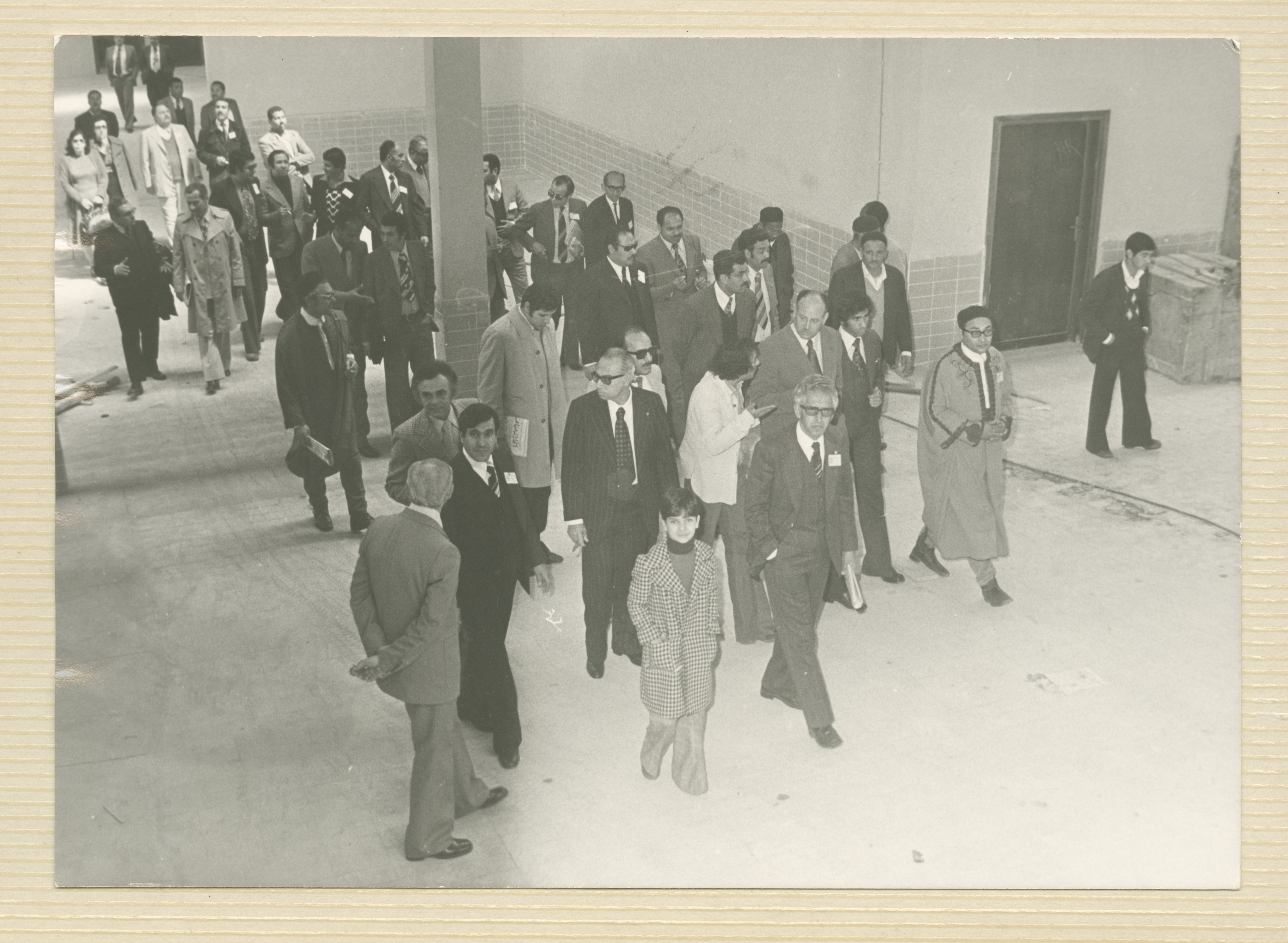 Taken during the period from 1971 to 1972, this photograph shows a part of the visit of a delegation of the Federation of Palestinian Bar Association, which included Yasser Amro, to a textile factory in Libya.