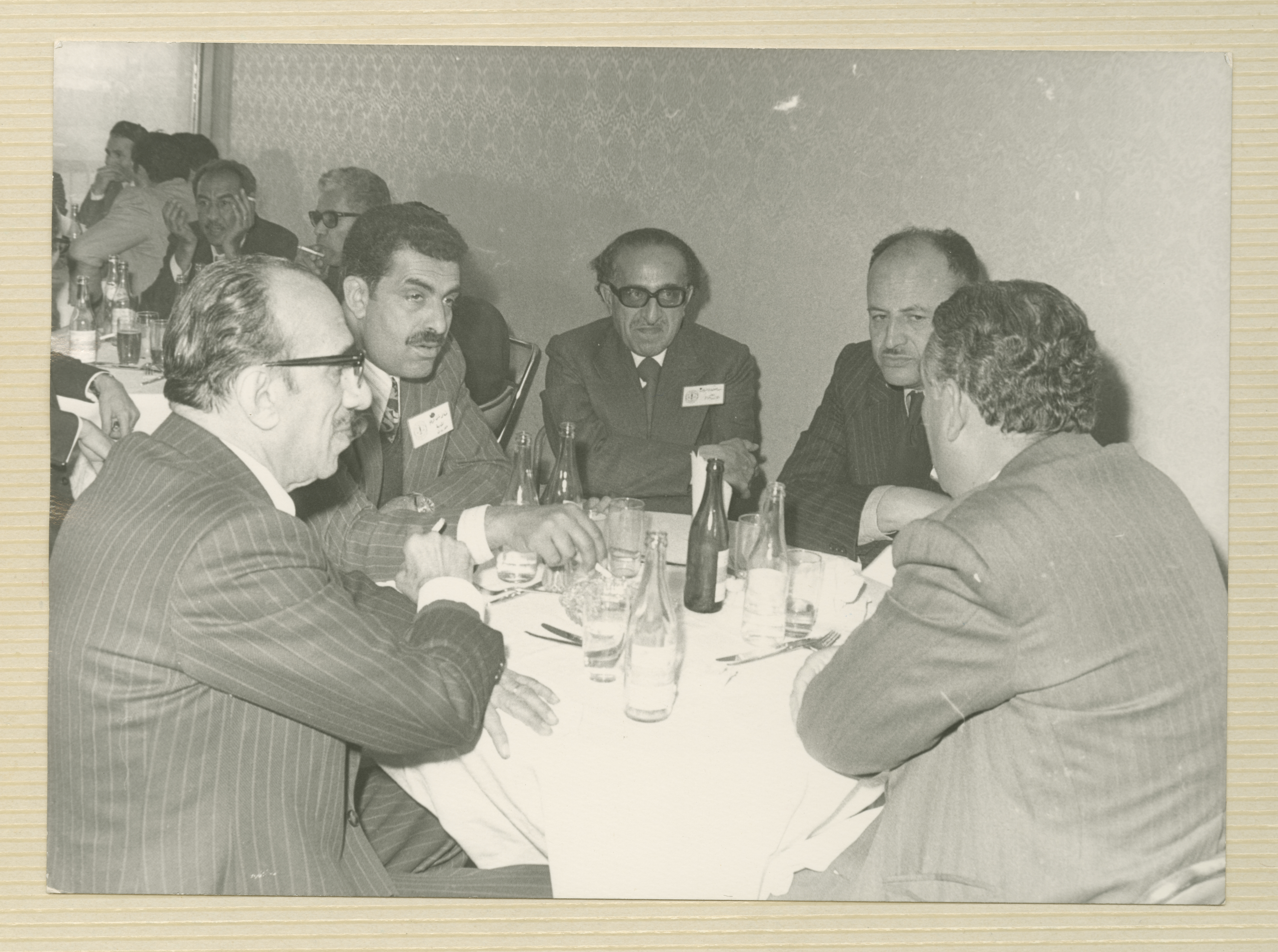 Taken during the period from 1971 to 1972, this photograph shows Yasser Amro, representative of the Palestinian Bar Association, second person from the right, during a visit of a delegation of the Association to Libya.