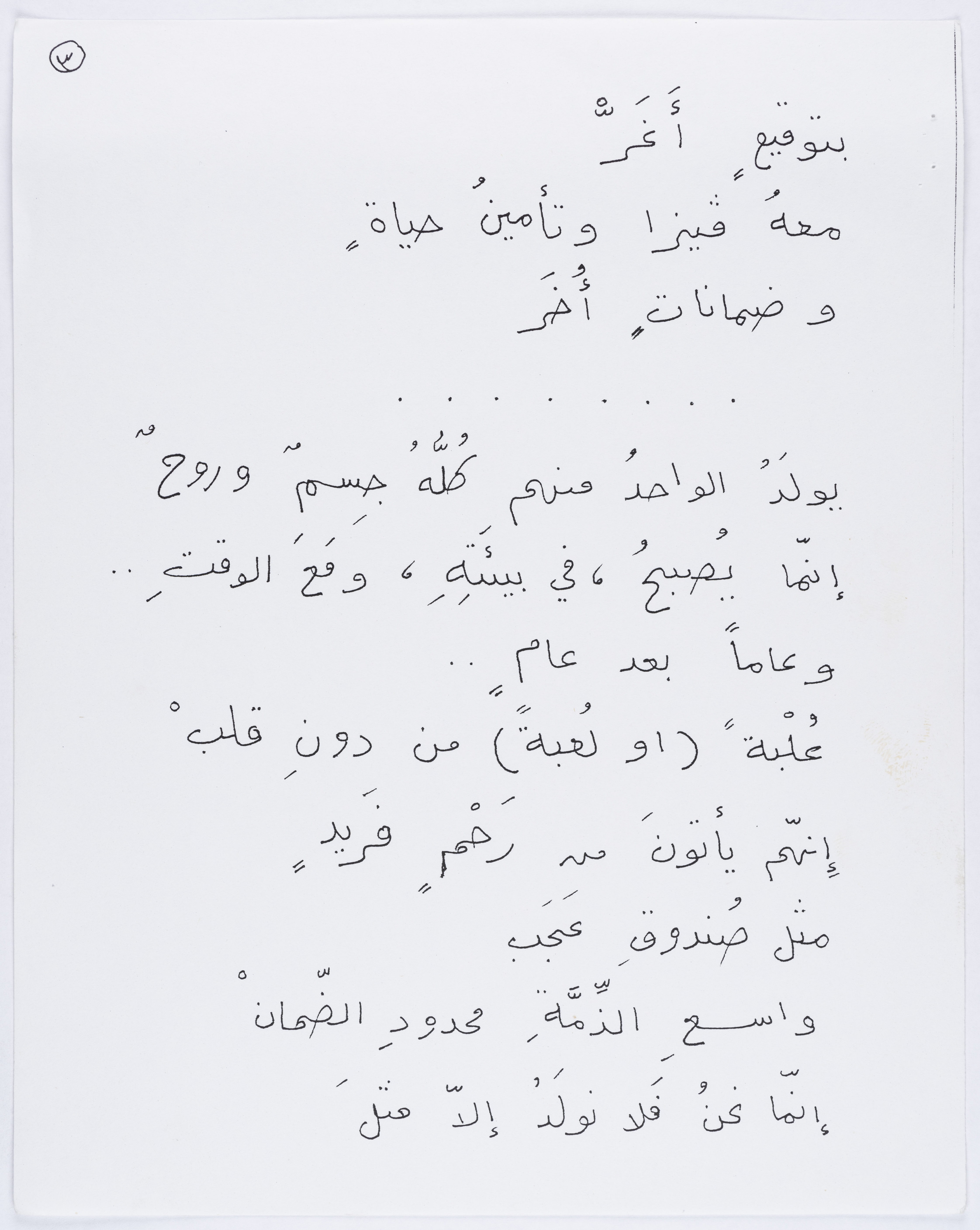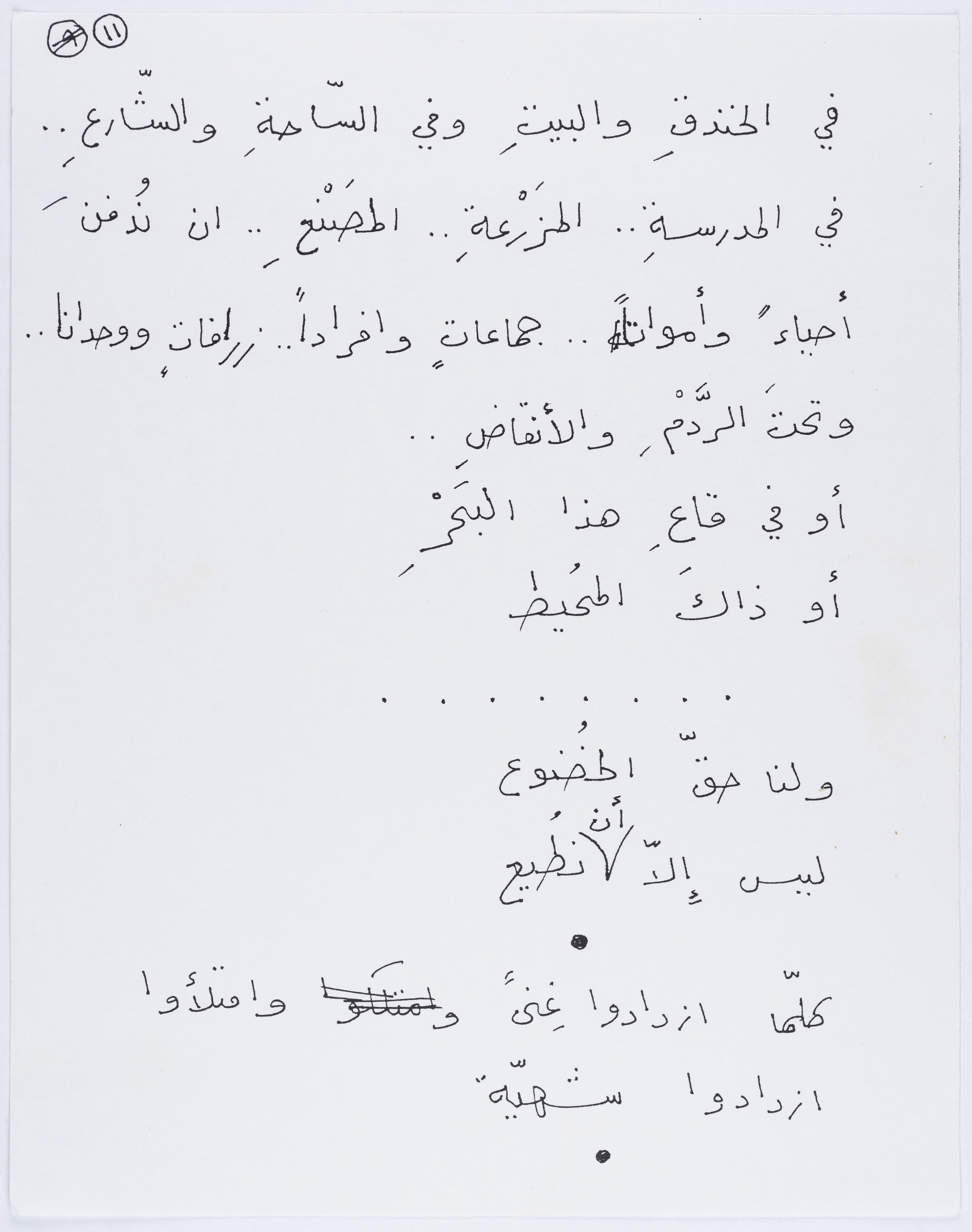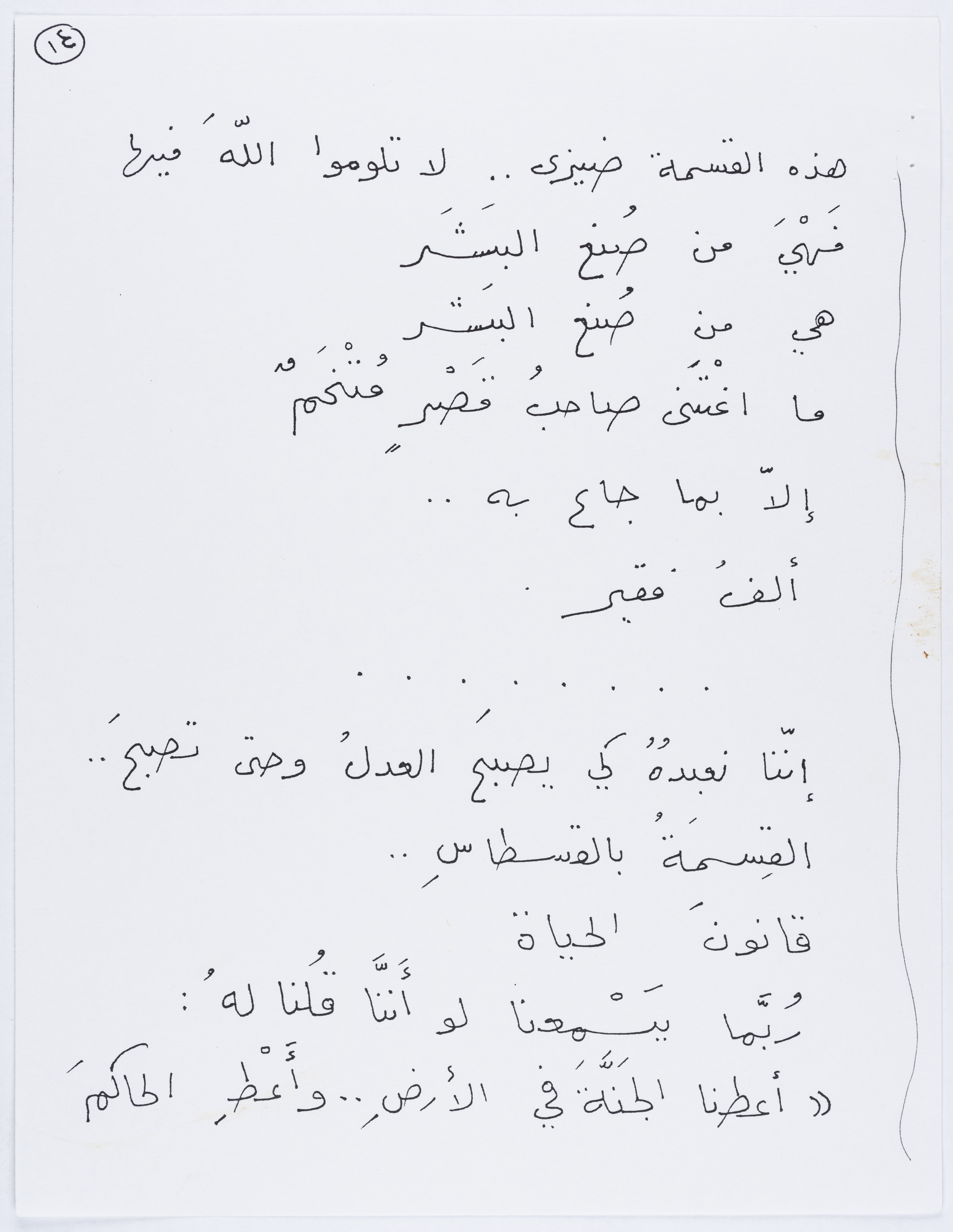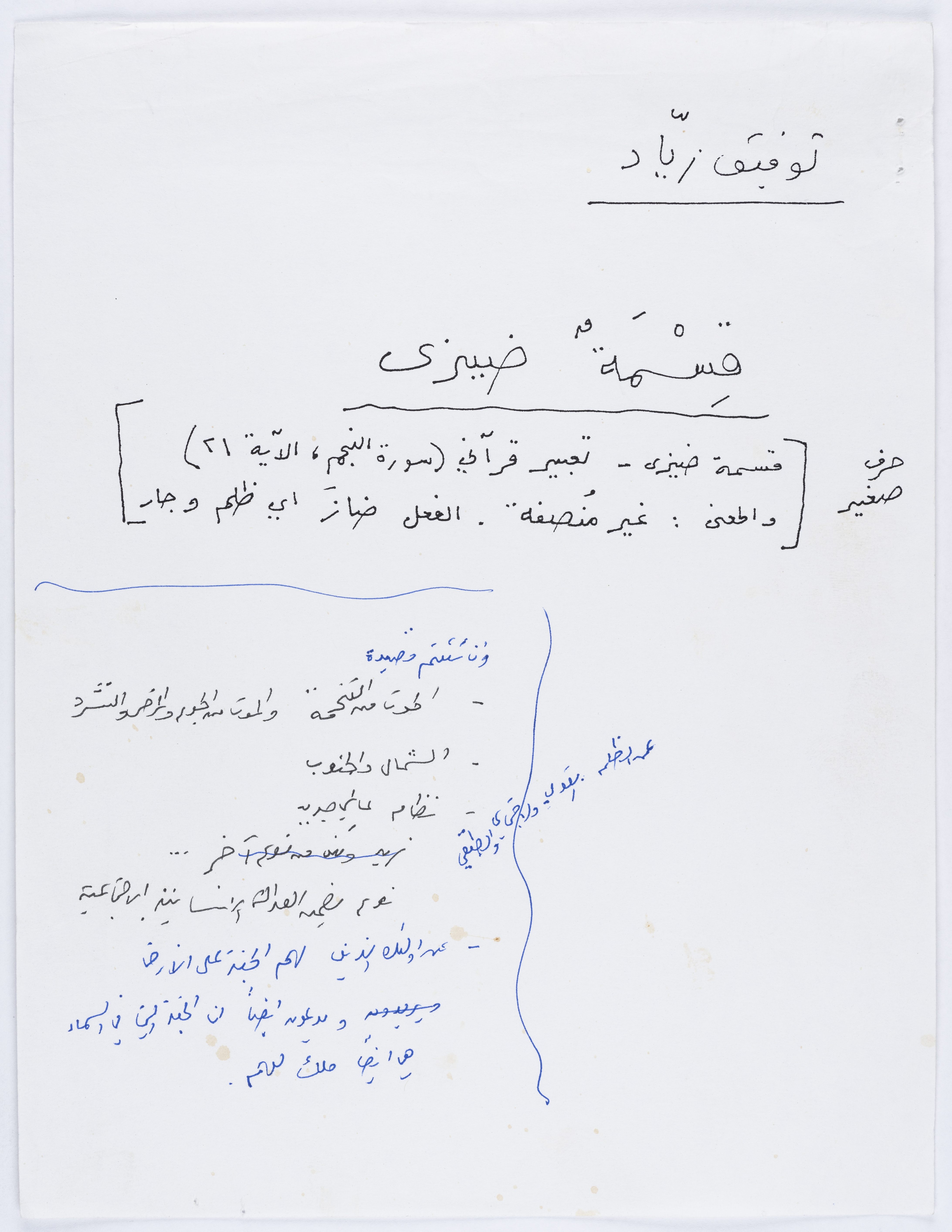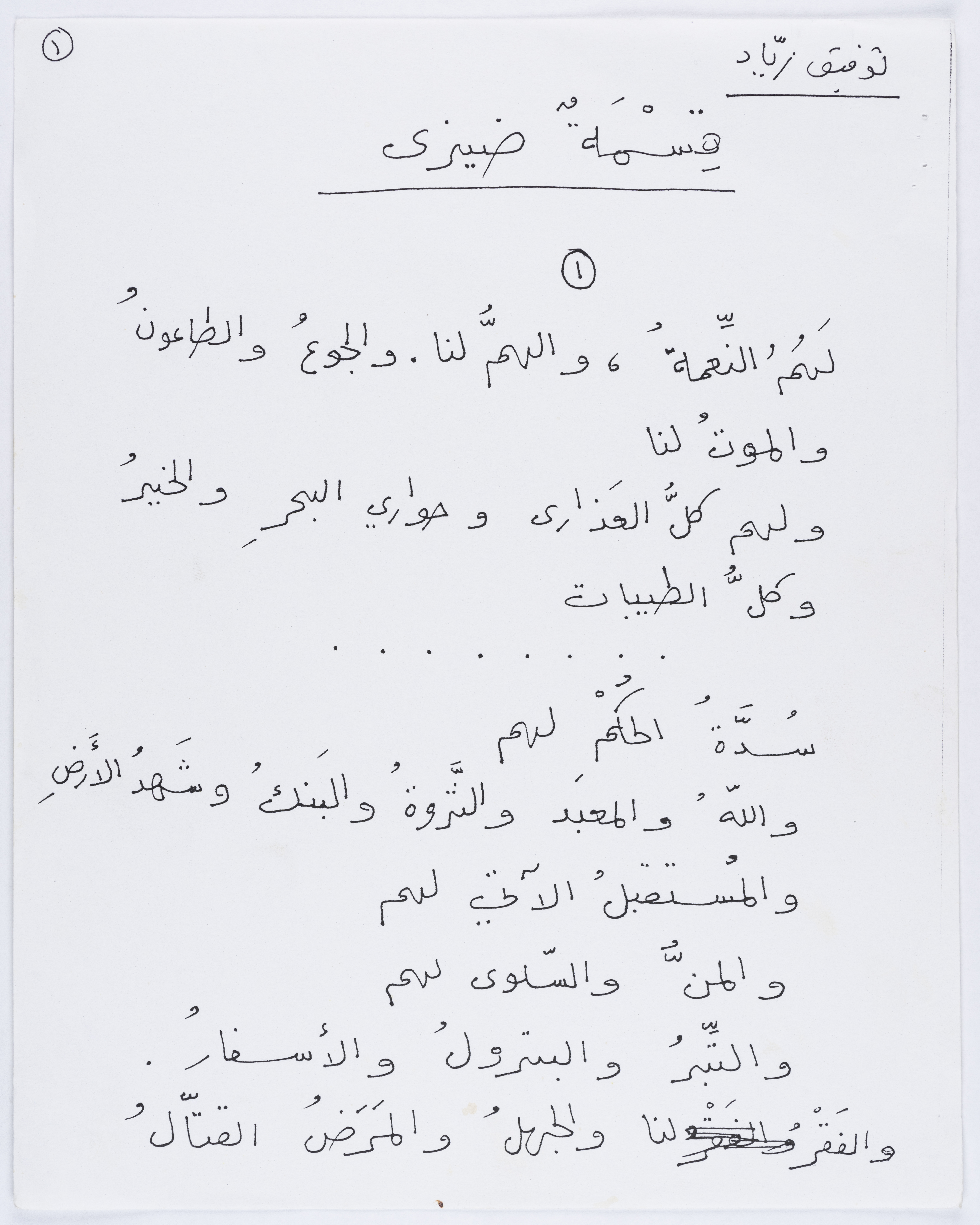 The draft; with notes, of a poem entitled "A Division Most Unfair" written by the poet Tawfiq Ziad and was found in his collection