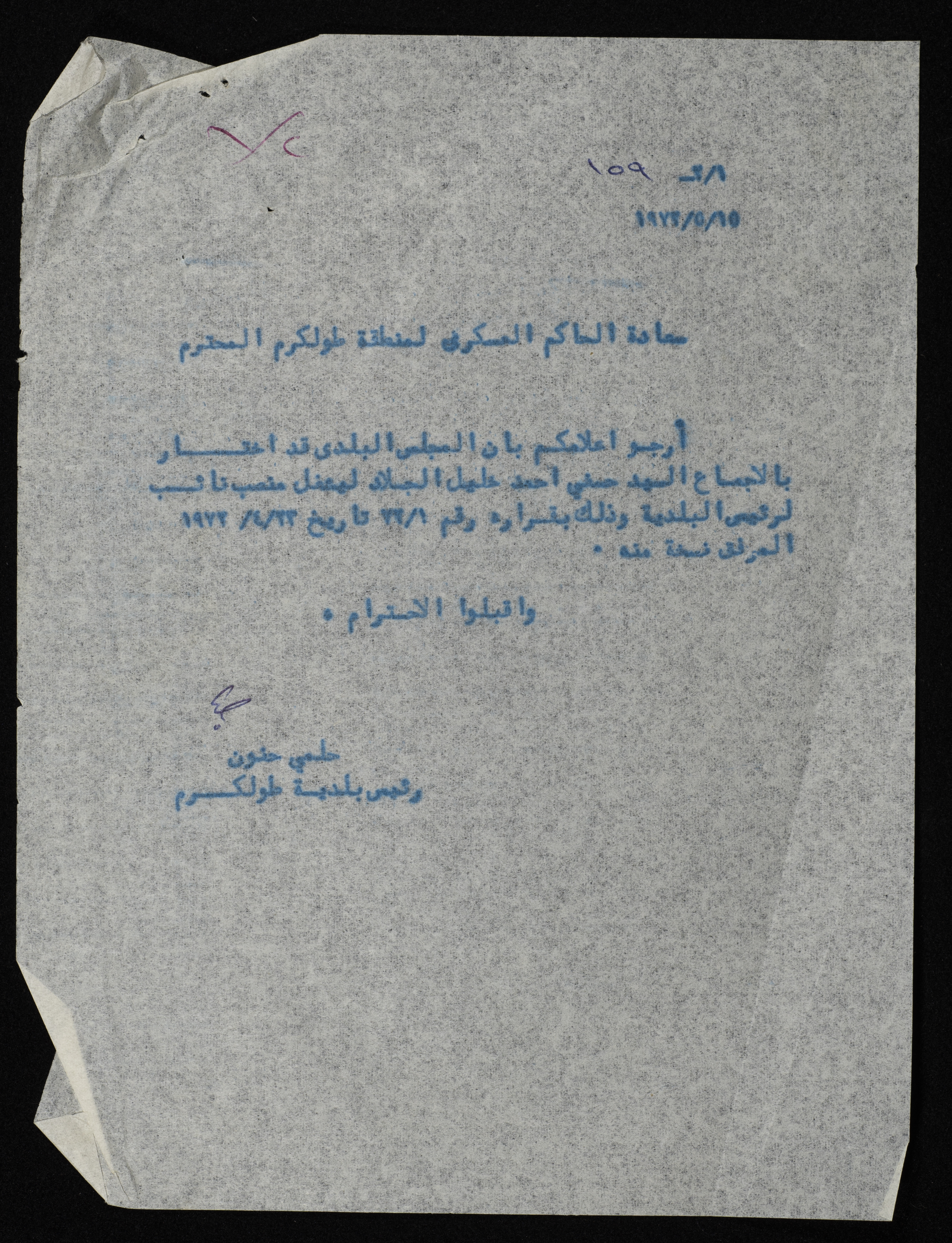 A one-page letter sent by Hilmy Hannun, mayor of Tulkarm, to the military governor of the Tulkarm area. In which Hilmy Hannun announces the municipal council's -in Tulkarm- decision to choose Husny al-Jallad as a deputy mayor.