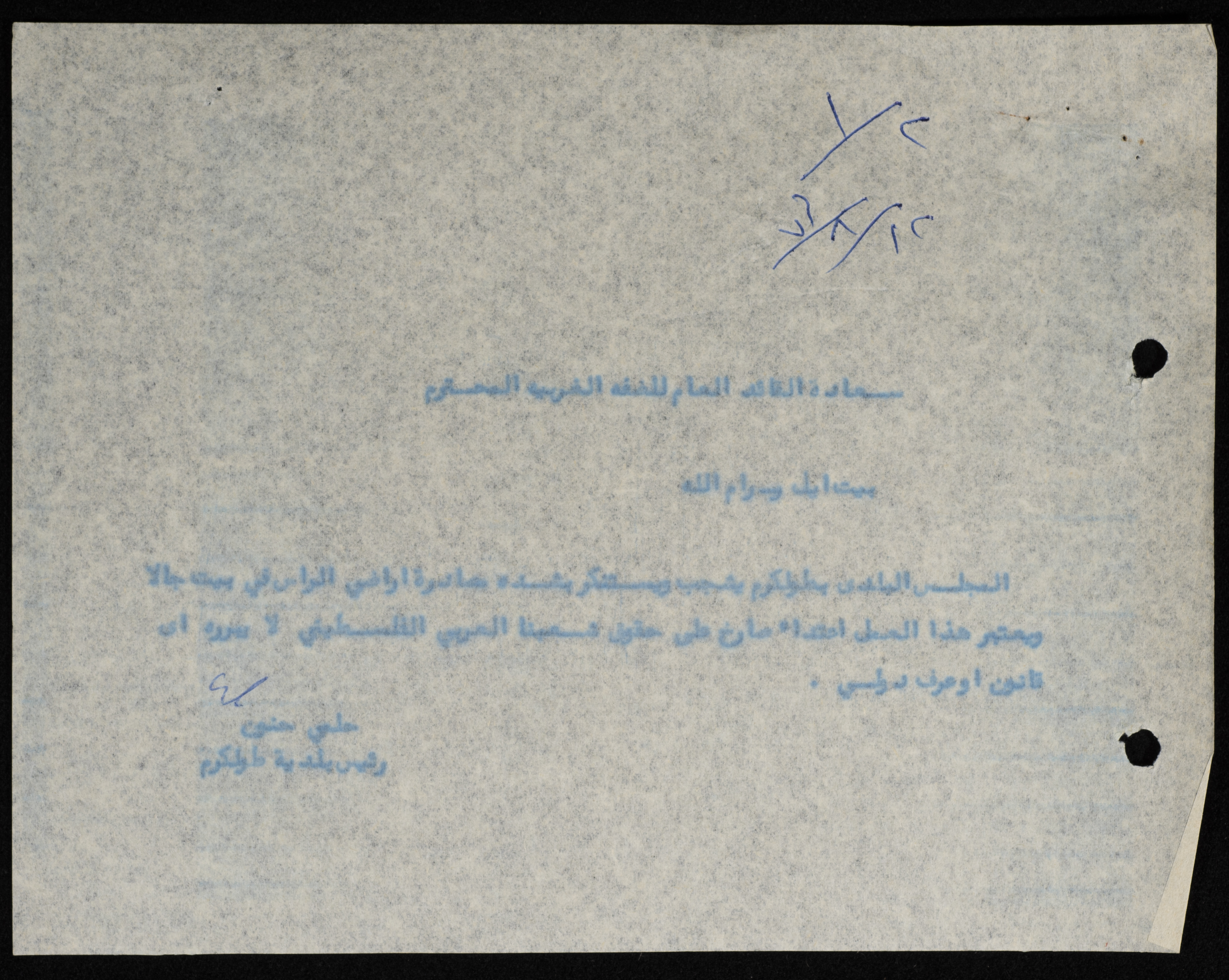 A Telegram Sent by the Mayor of Tulkarm to the Military Governor of the West Bank