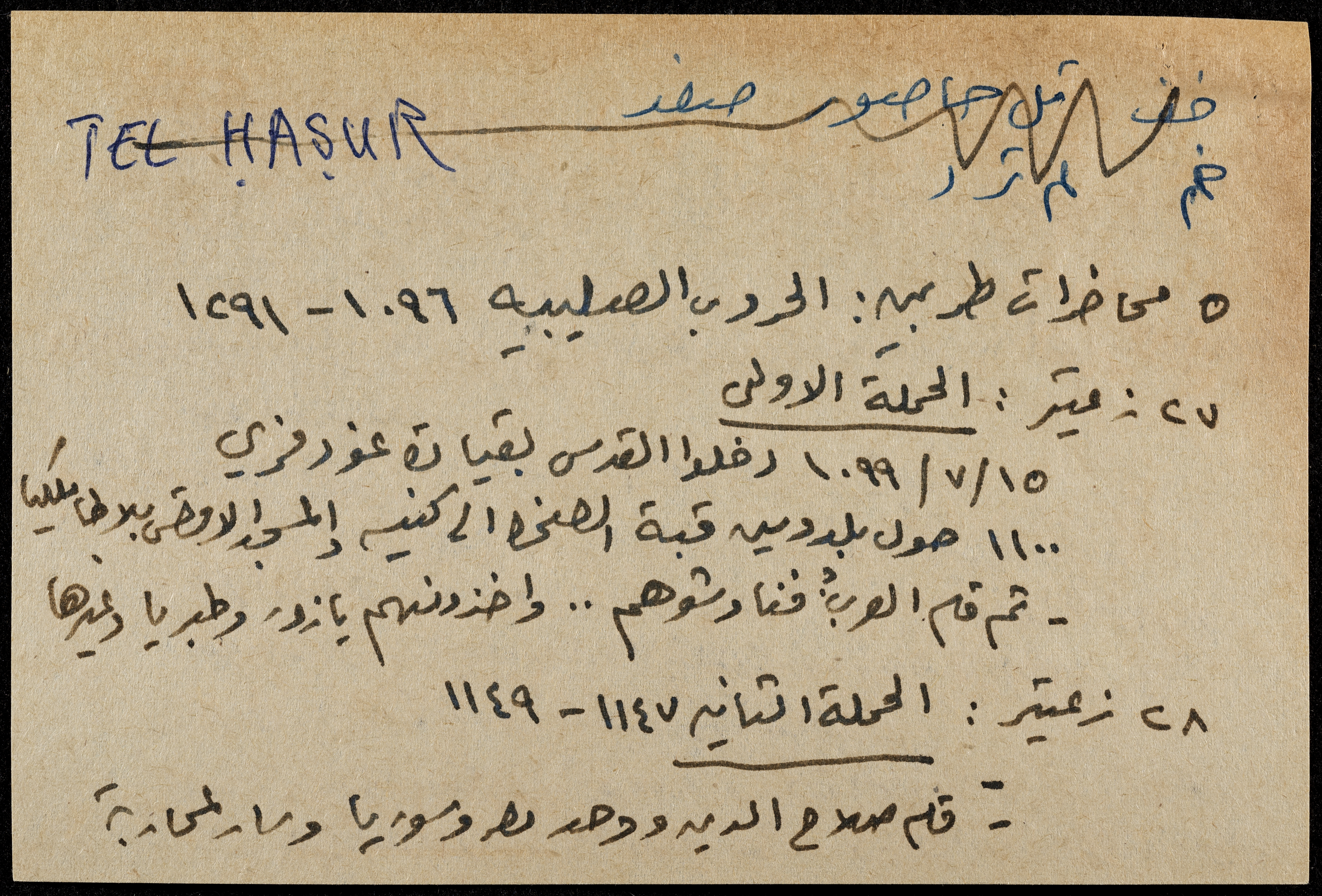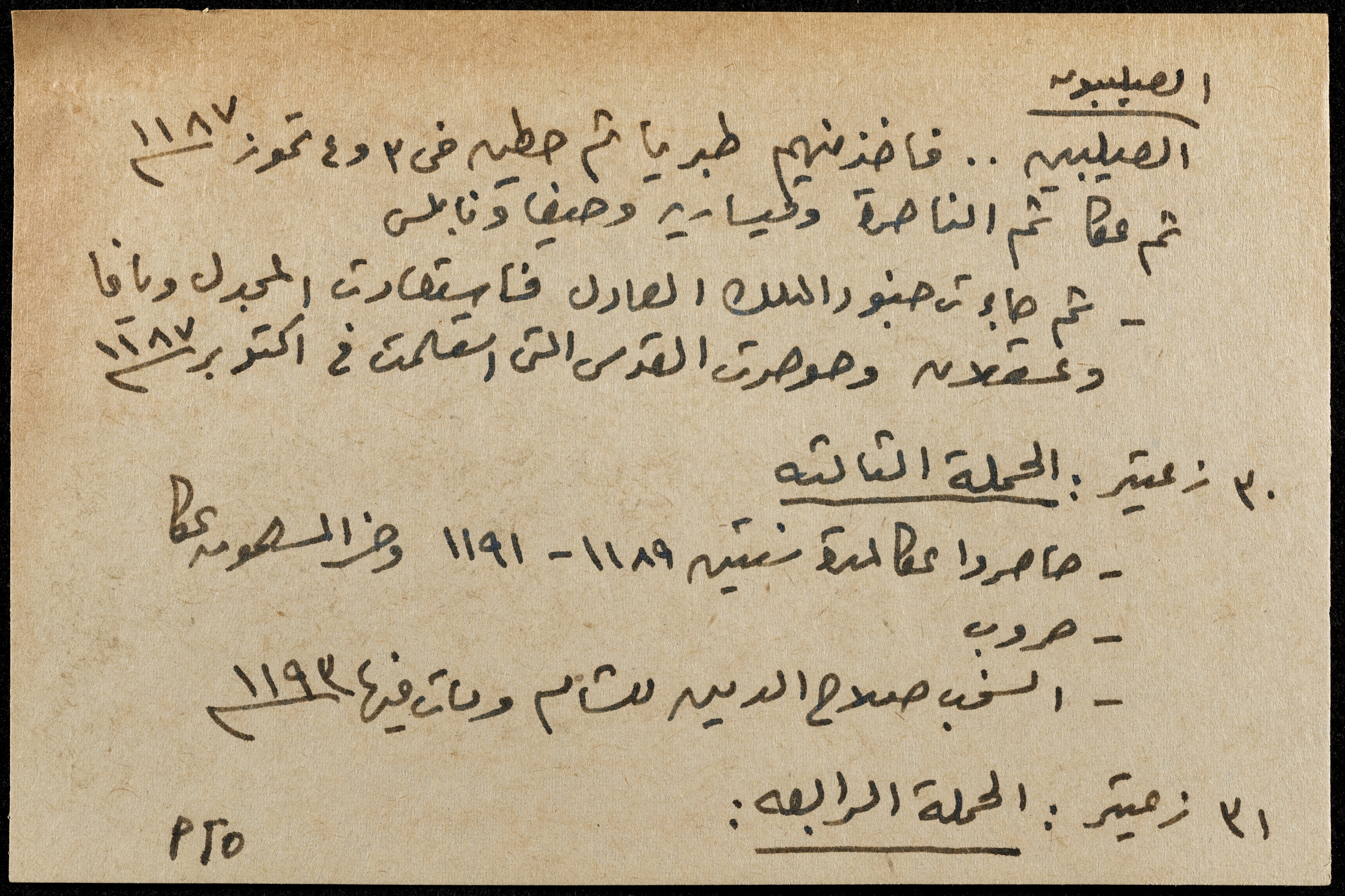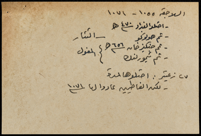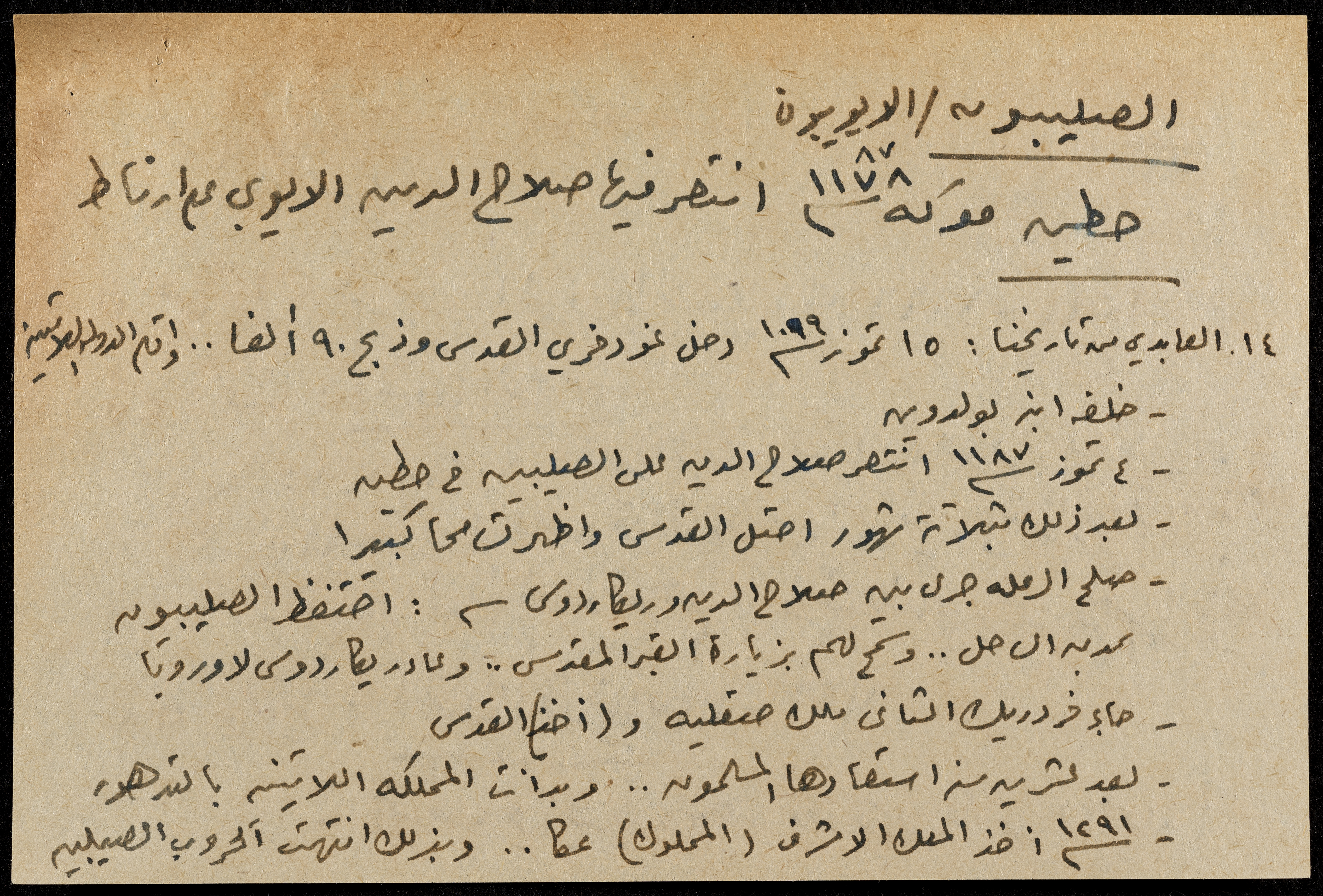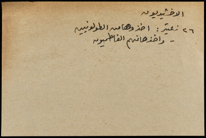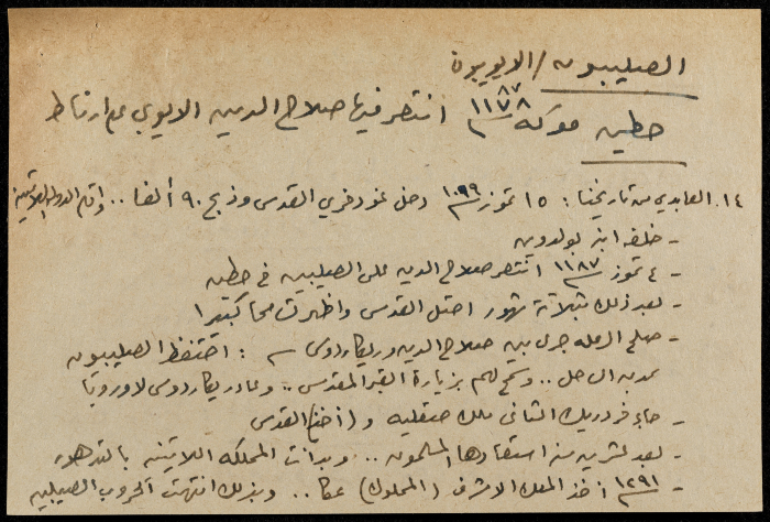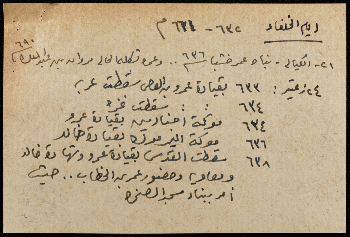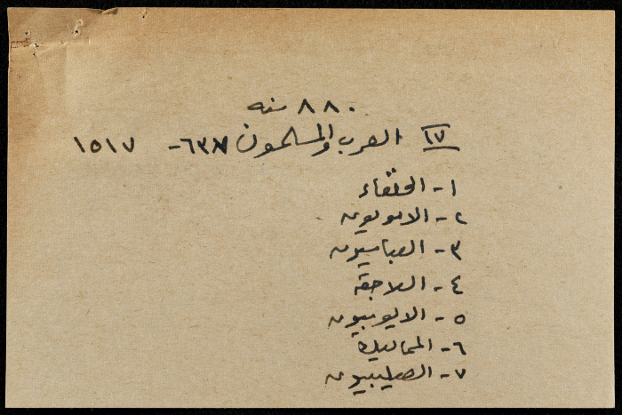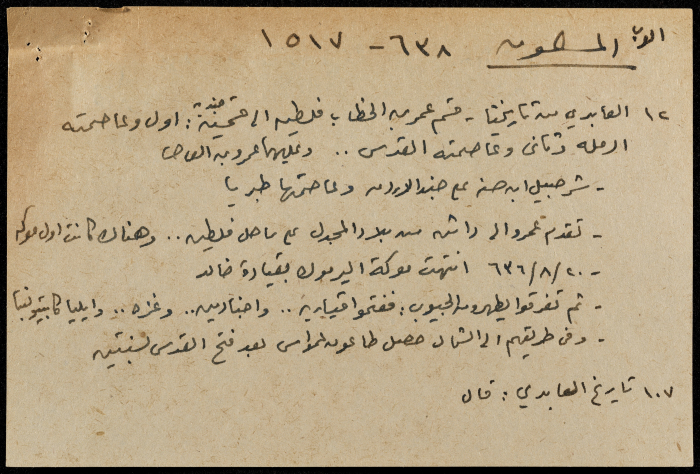 A hand-written paper clipping in Arabic, entitled "Arabs and Muslims" from 637 AD to 1517.