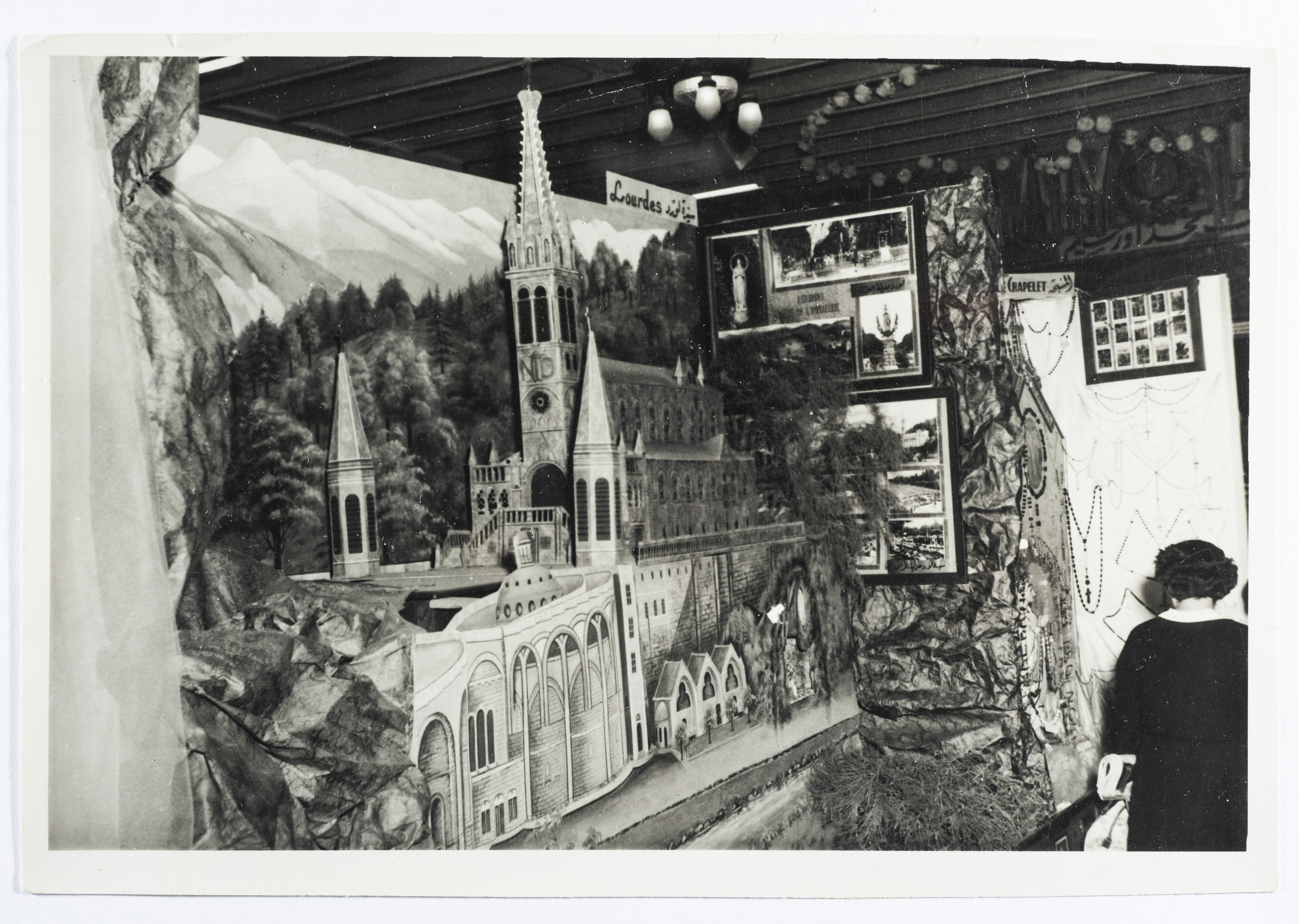 بطاقة بريدية تظهر فيها لقطة داخلية من إحدى كنائس فلسطين، صدرت عن ستوديو سمعان السحار