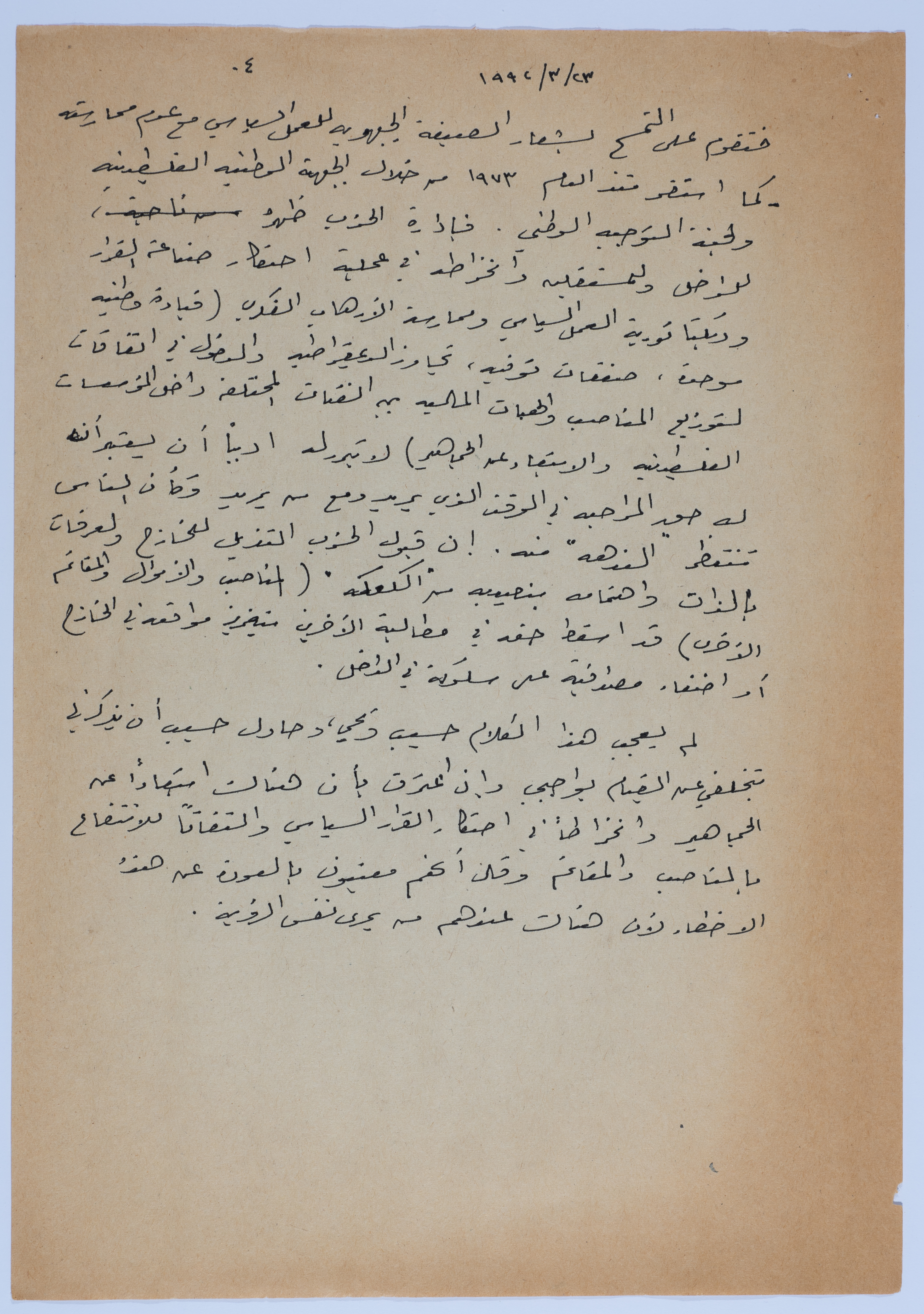 مادة مكتوبة باللغة العربية، وهي مقالة من لقاء مع السيد بسام الشكعة من 4 صفحات، بتاريخ 23 آذار 1992، حول الوضع الفلسطيني القائم والتخبط الفلسطيني الخارجي.