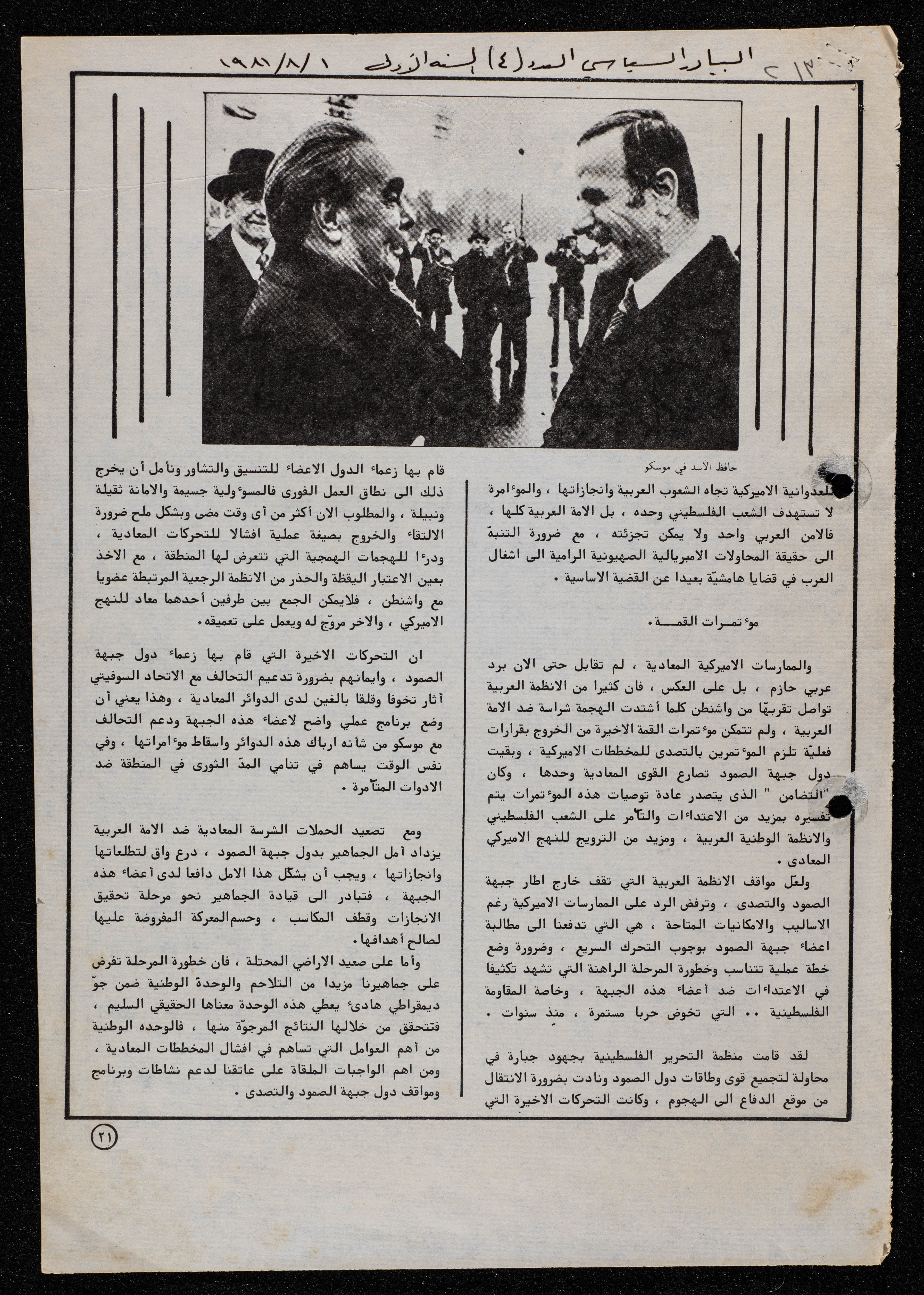 An assortment of magazine clippings from al-Bayader al-Siyasi, no 4, 1981 including an article written by Ibrahim ad-Daqqaq entitled "The 1981 Israeli Elections Battle."