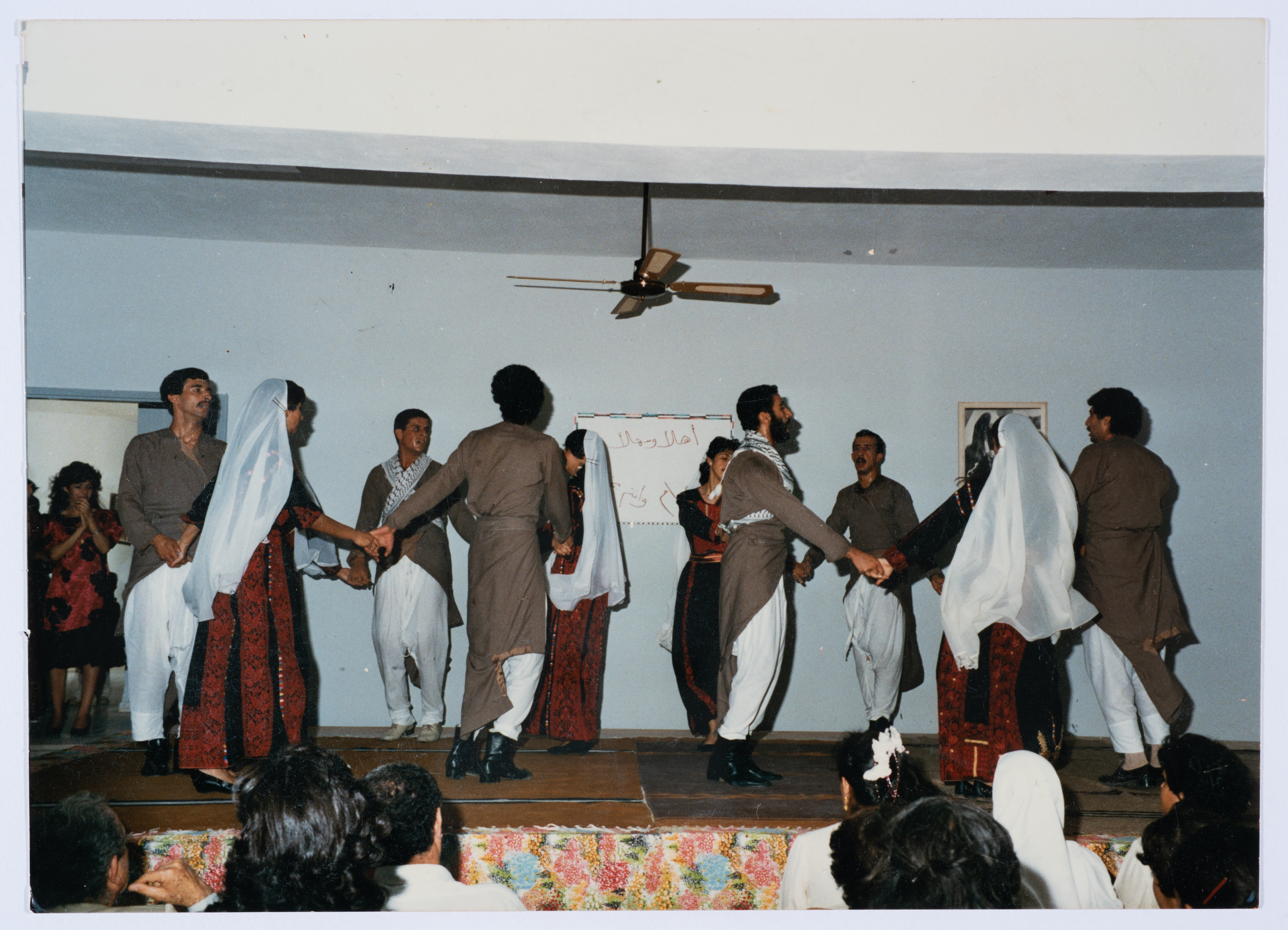 صورة ملونة، من مشاركة فرقة الشهيد شرف الطيبي من جامعة بيرزيت باحتفال أُقيم في جمعية مخيم قلنديا النسائية التعاونية، بمناسبة تخرج فوج من طالبات الجمعية.