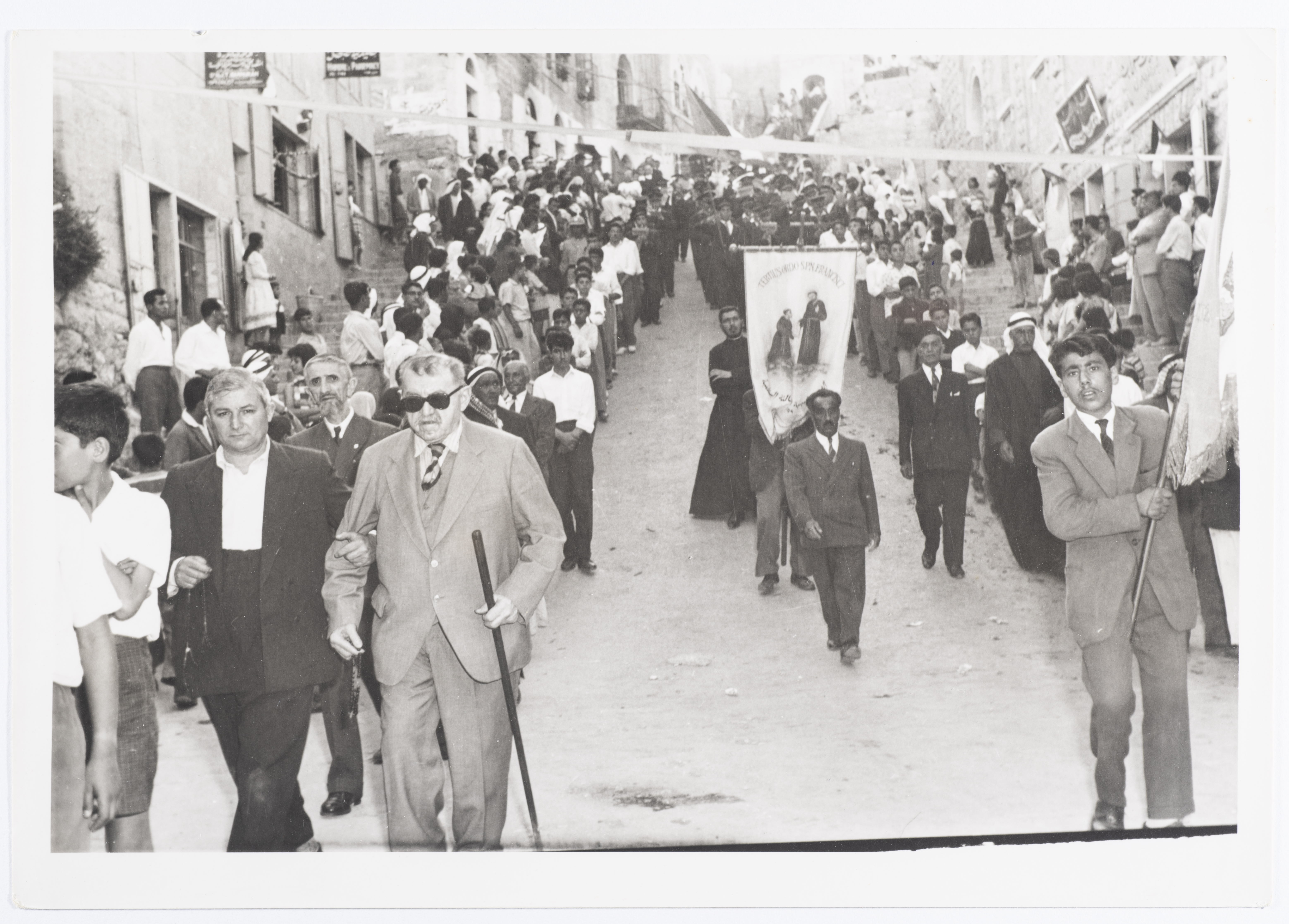 Issued by Saman Sahar Photo Studio, this black-and-white postcard features a photograph of a procession that was held as part of a Christian religious ceremony.