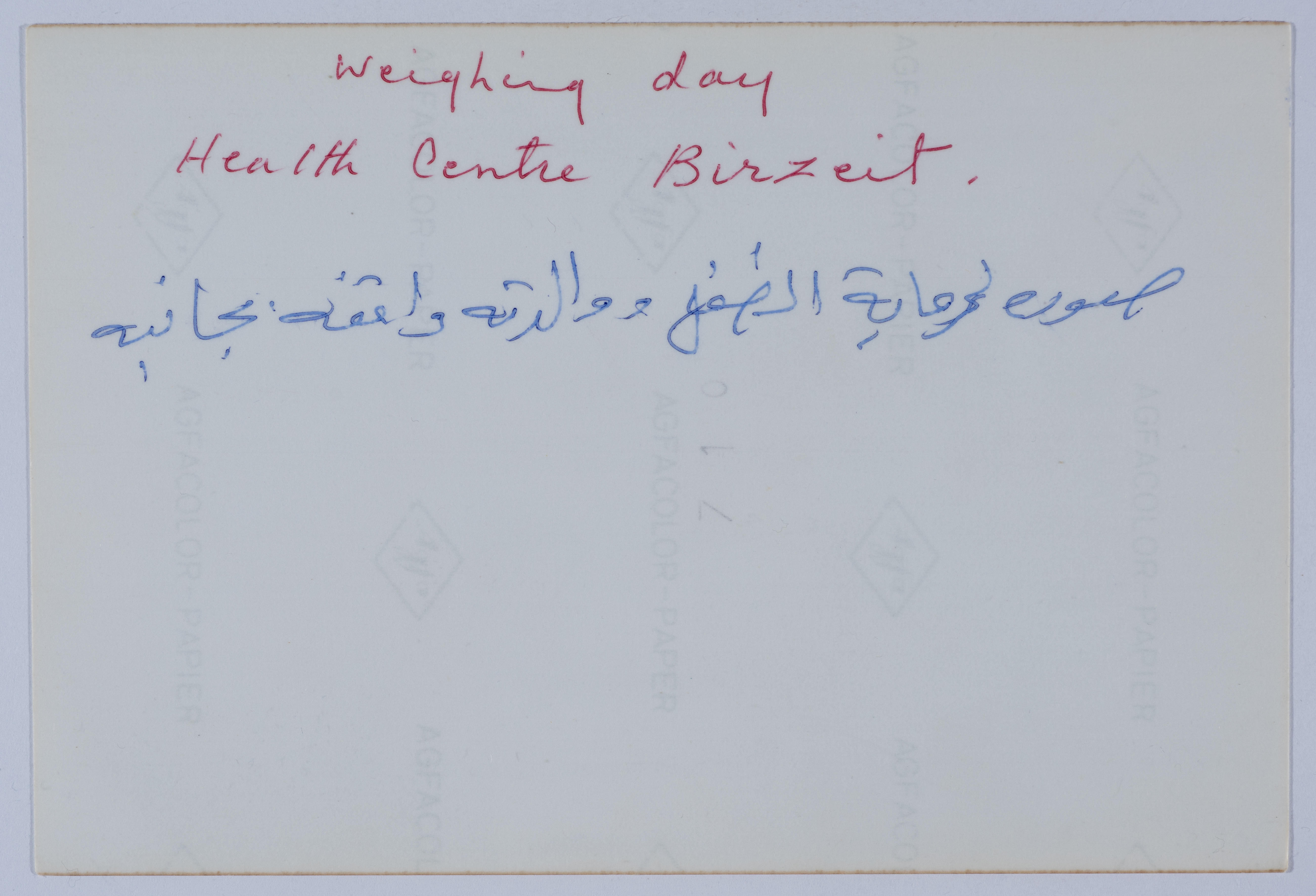 A colour photograph of a nurse as she weighs a child at Birzeit Women Charitable Society's Healthcare Centre.