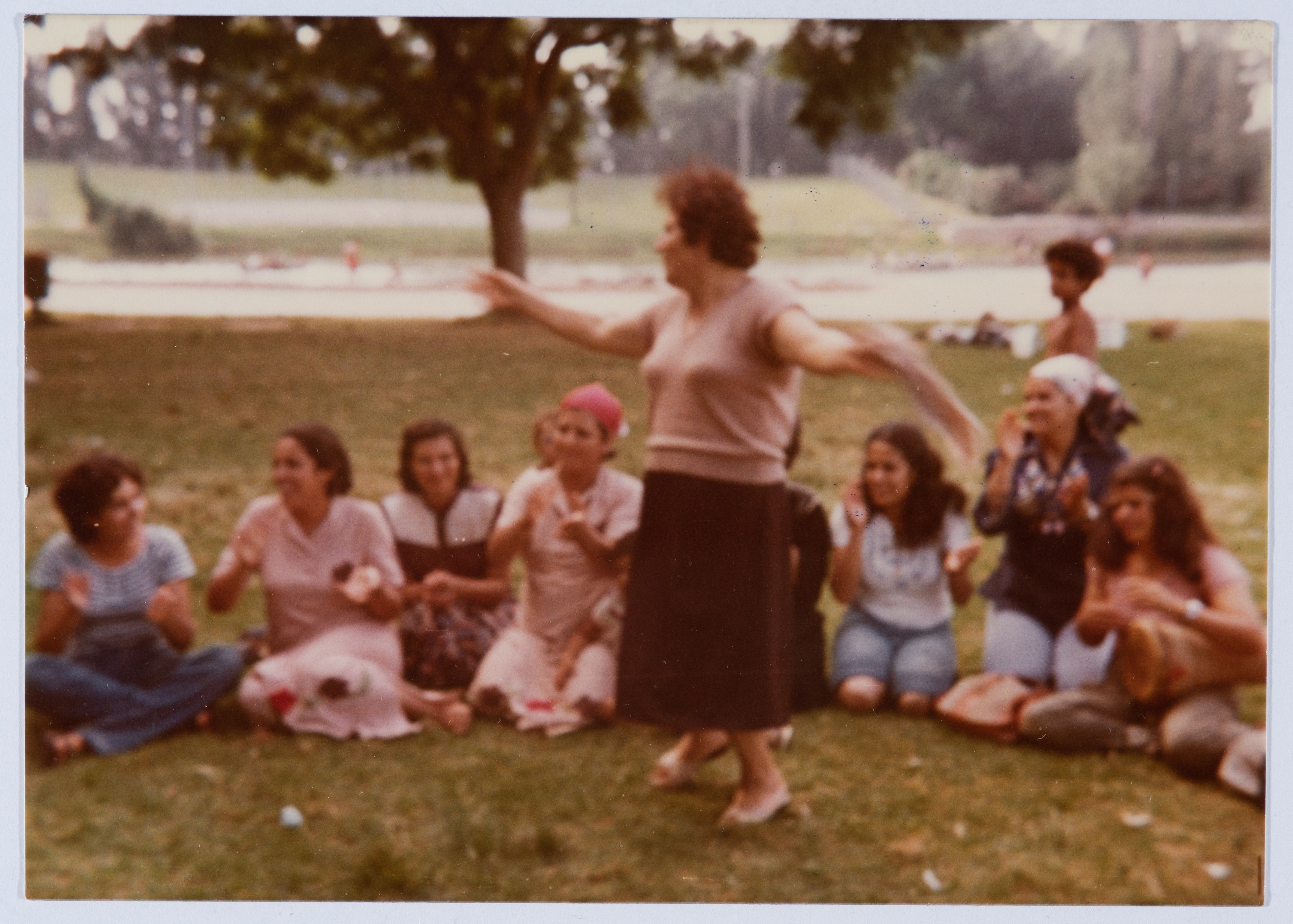 A colour photograph of the staff of Birzeit Women's Charitable Society on a trip, including Lam'a Qisses, board member.