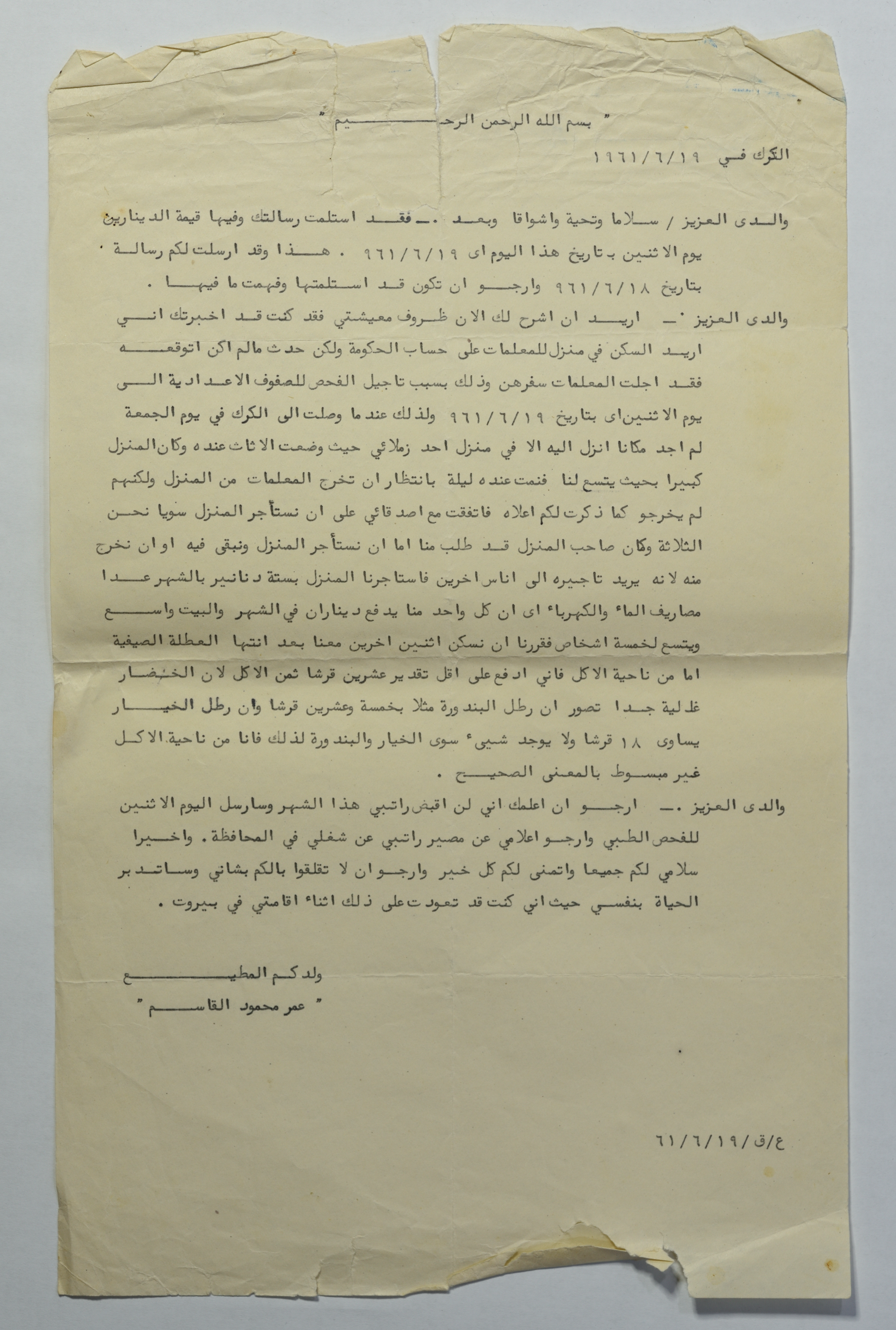رسالة مؤرخة في 19 حزيران 1961، أرسلها عمر القاسم في الكرك إلى والده في القدس، وفيها شرح ظروف معيشته في مدينة الكرك في الأردن.