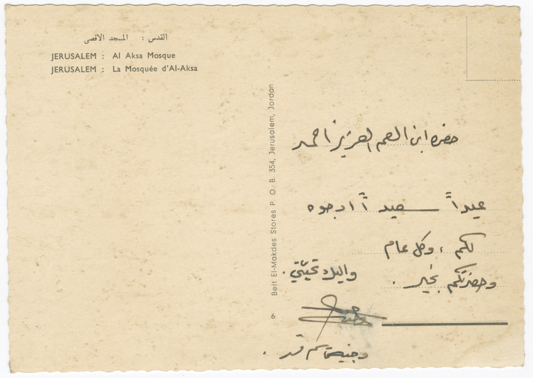 بطاقة بريدية مُرسلة من وجيه القاسم في عمان إلى أحمد القاسم في القدس، لتهنئته بالعيد، وذلك في سبعينيات القرن العشرين.