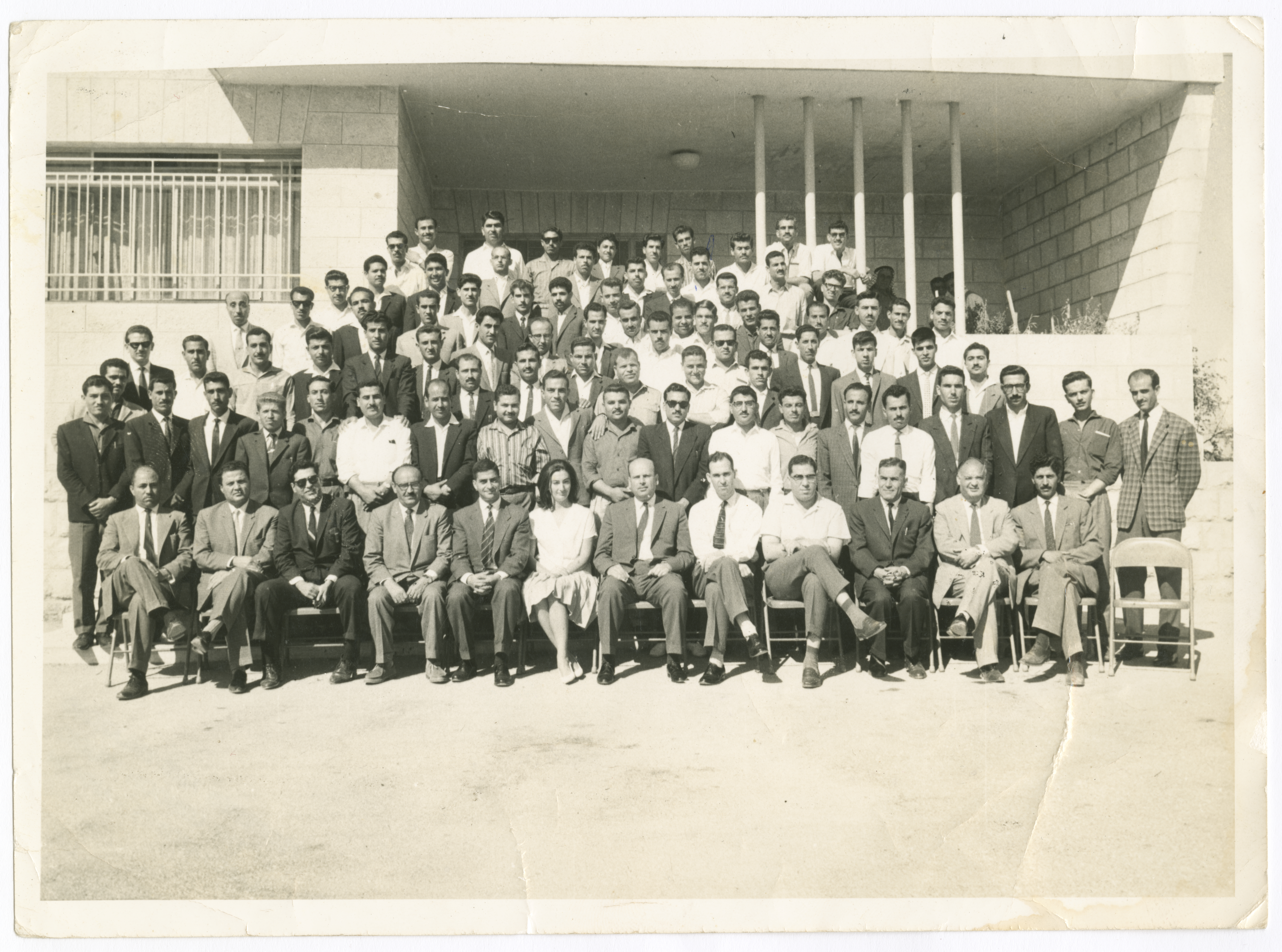 صورة لعمر محمود القاسم ومجموعة من الأشخاص الذين لم تعرف أسماؤهم، التُقطت في ستينيات القرن العشرين من أمام أحد المباني في عمان.