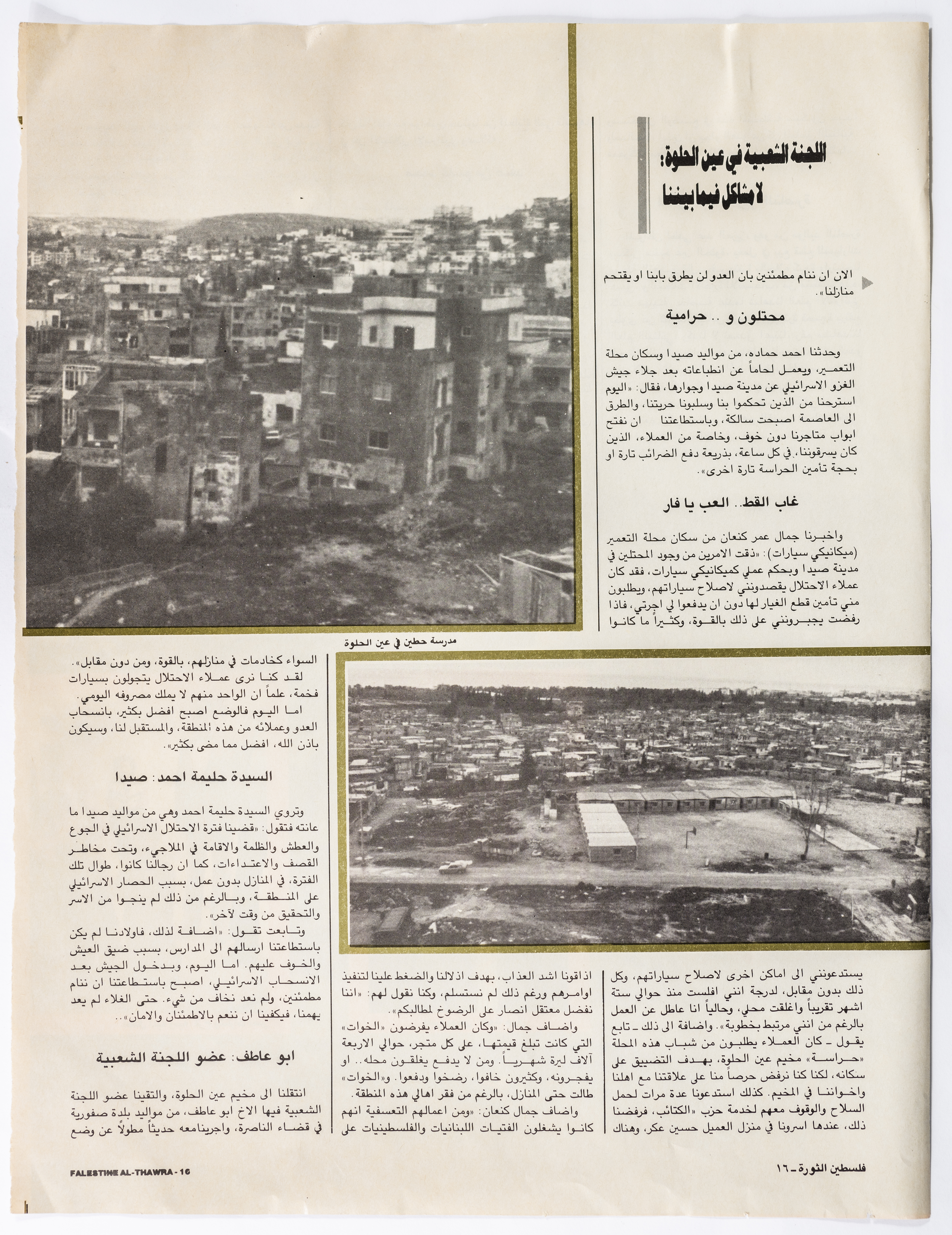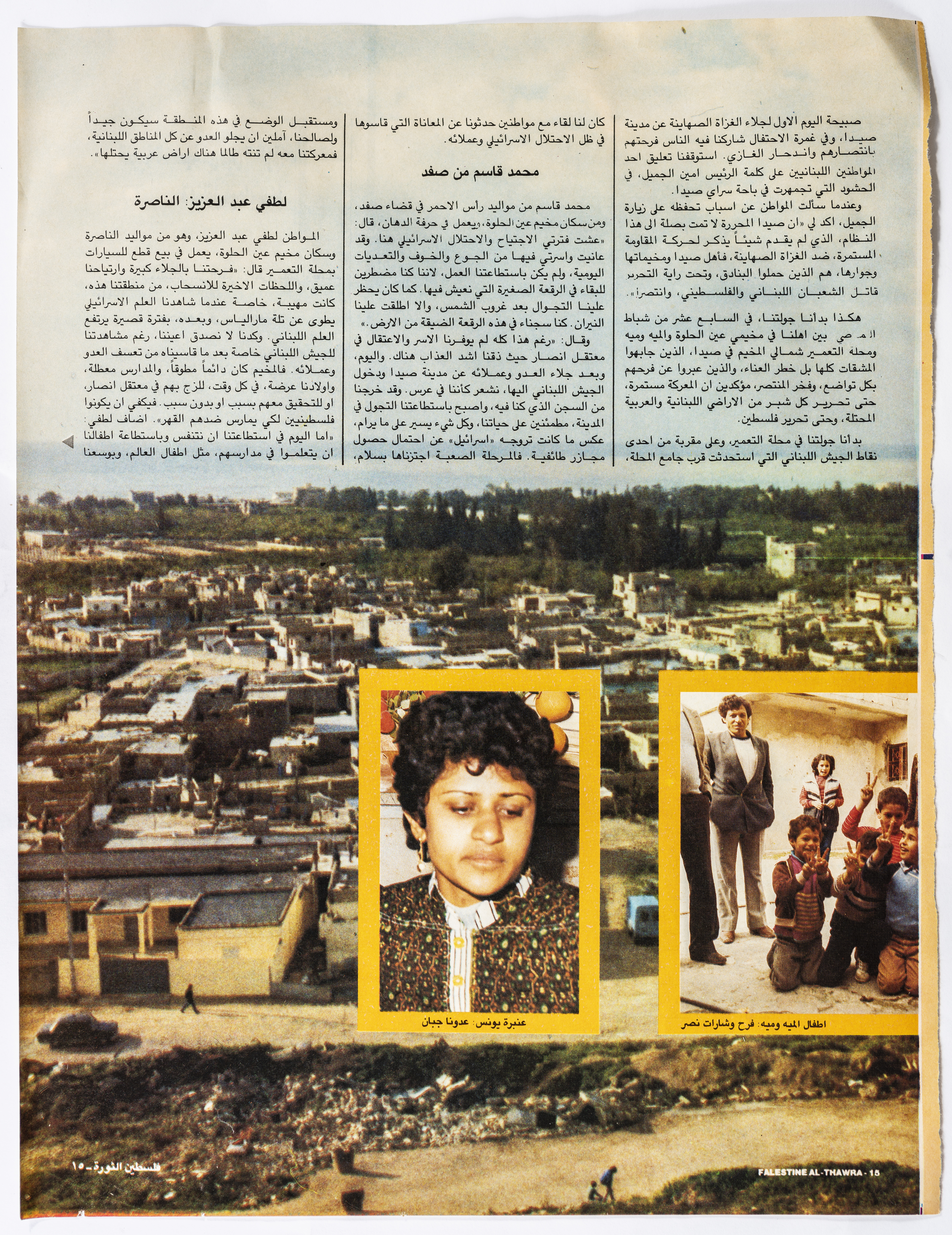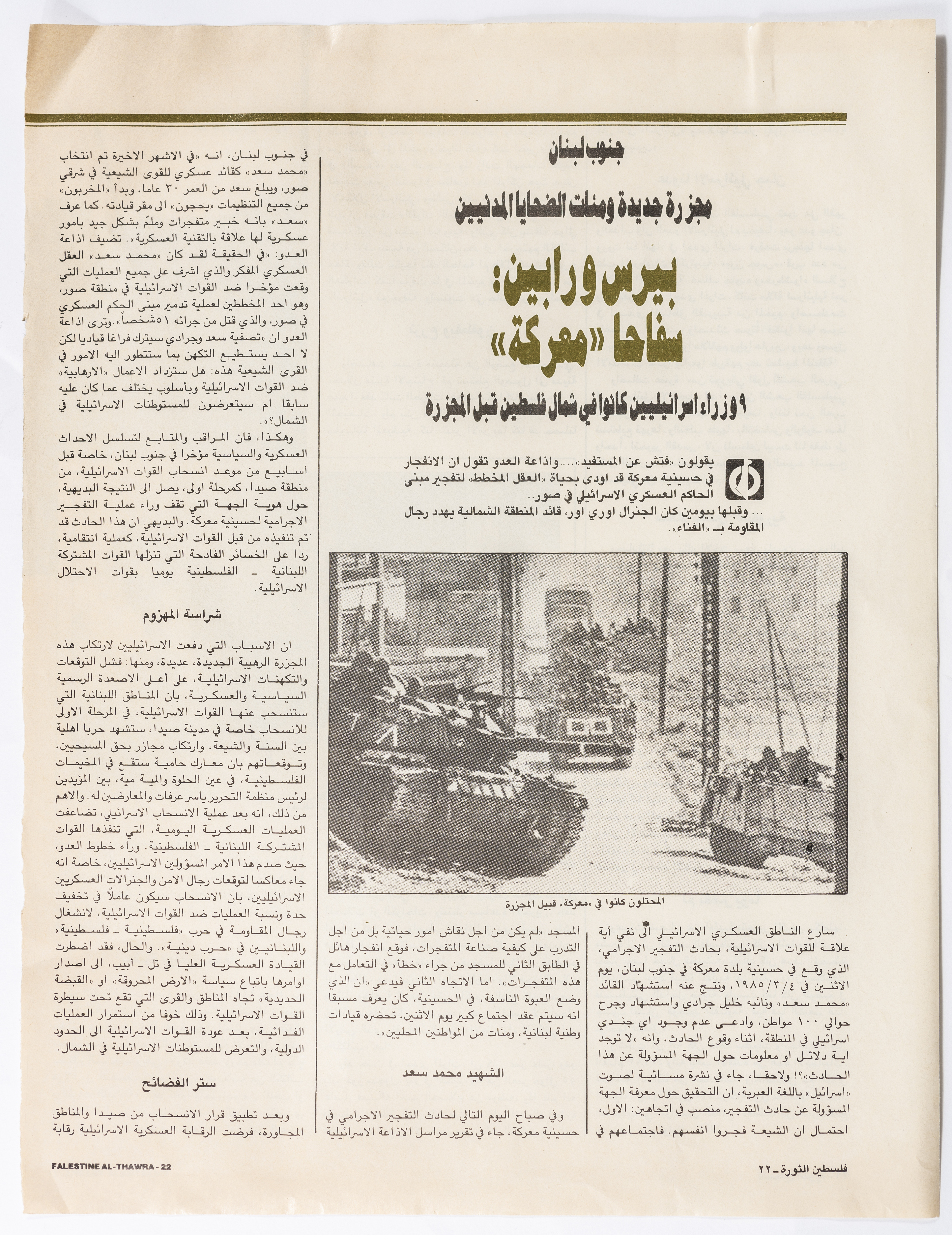 Issued in the 1980s, this document shows ten pages from an issue of Falastine ath-Thawra Newspaper, containing a report titled "Wars Do Not Break the Palestinian" on the Israeli Occupation Forces' withdrawal from the city of Sidon and the surrounding Palestinian camps in addition to an article titled "Peres and Rabin: The Butchers of Maarakeh" on the detonation of the husayniyya of the Maarakeh town in South Lebanon on 4 March 1985.