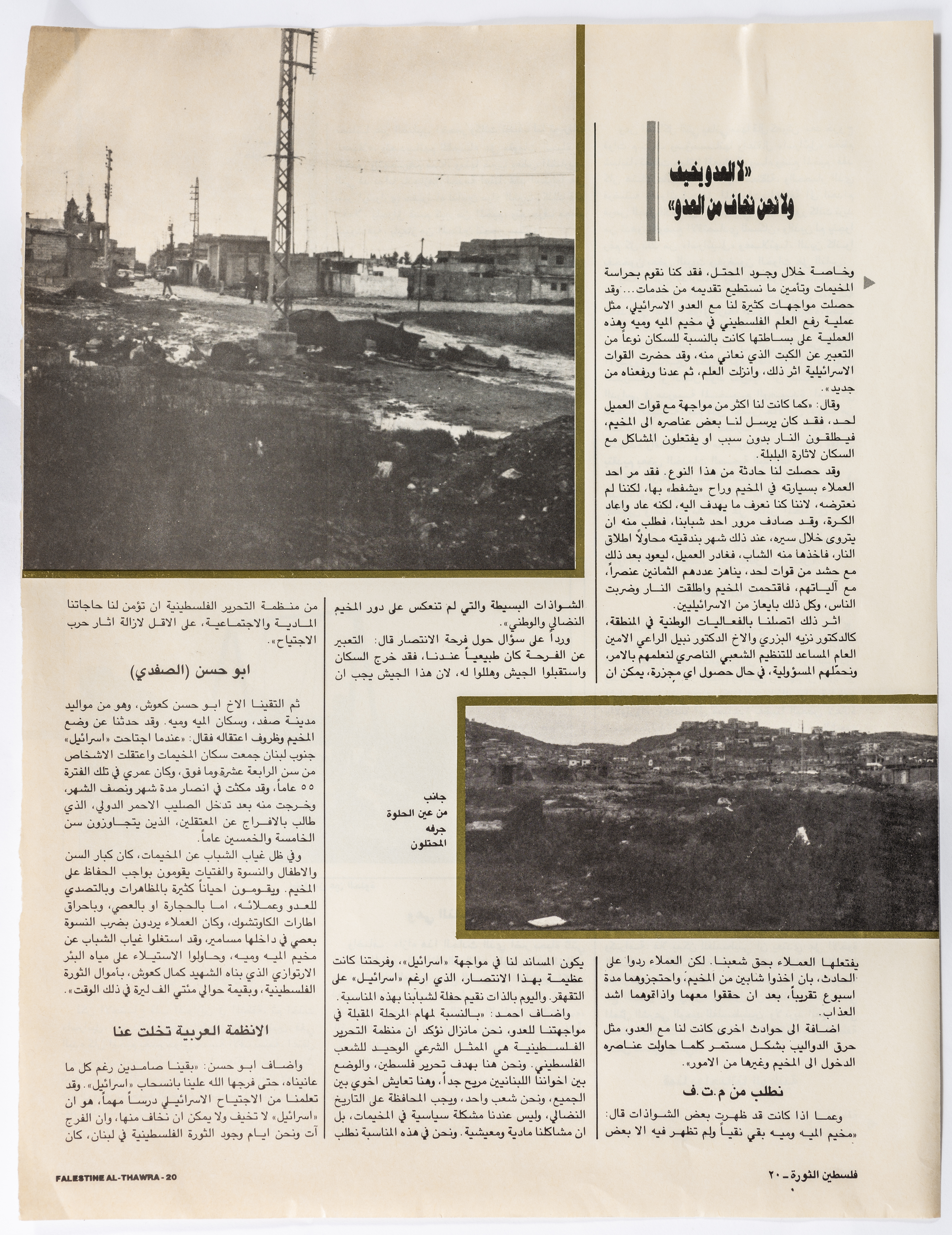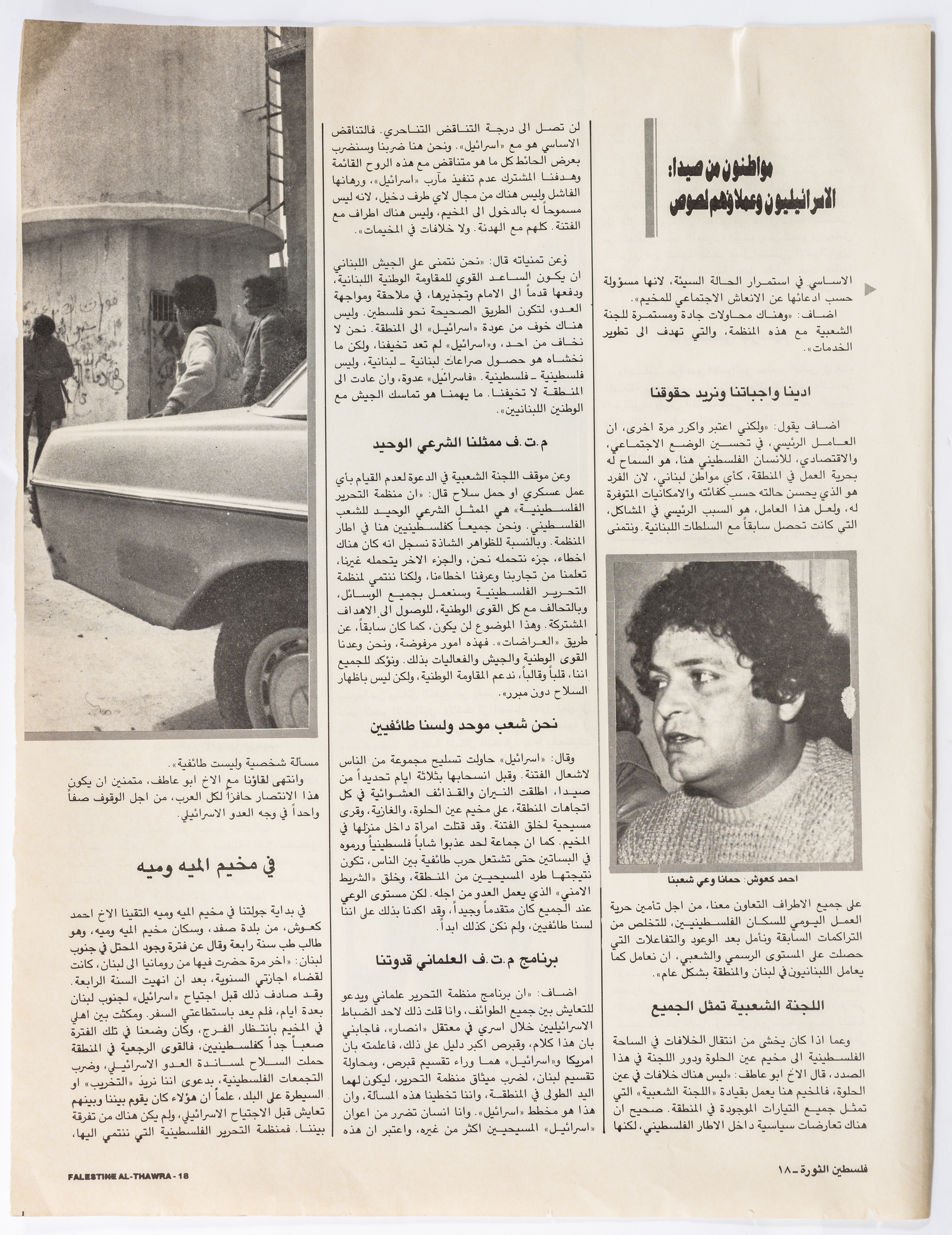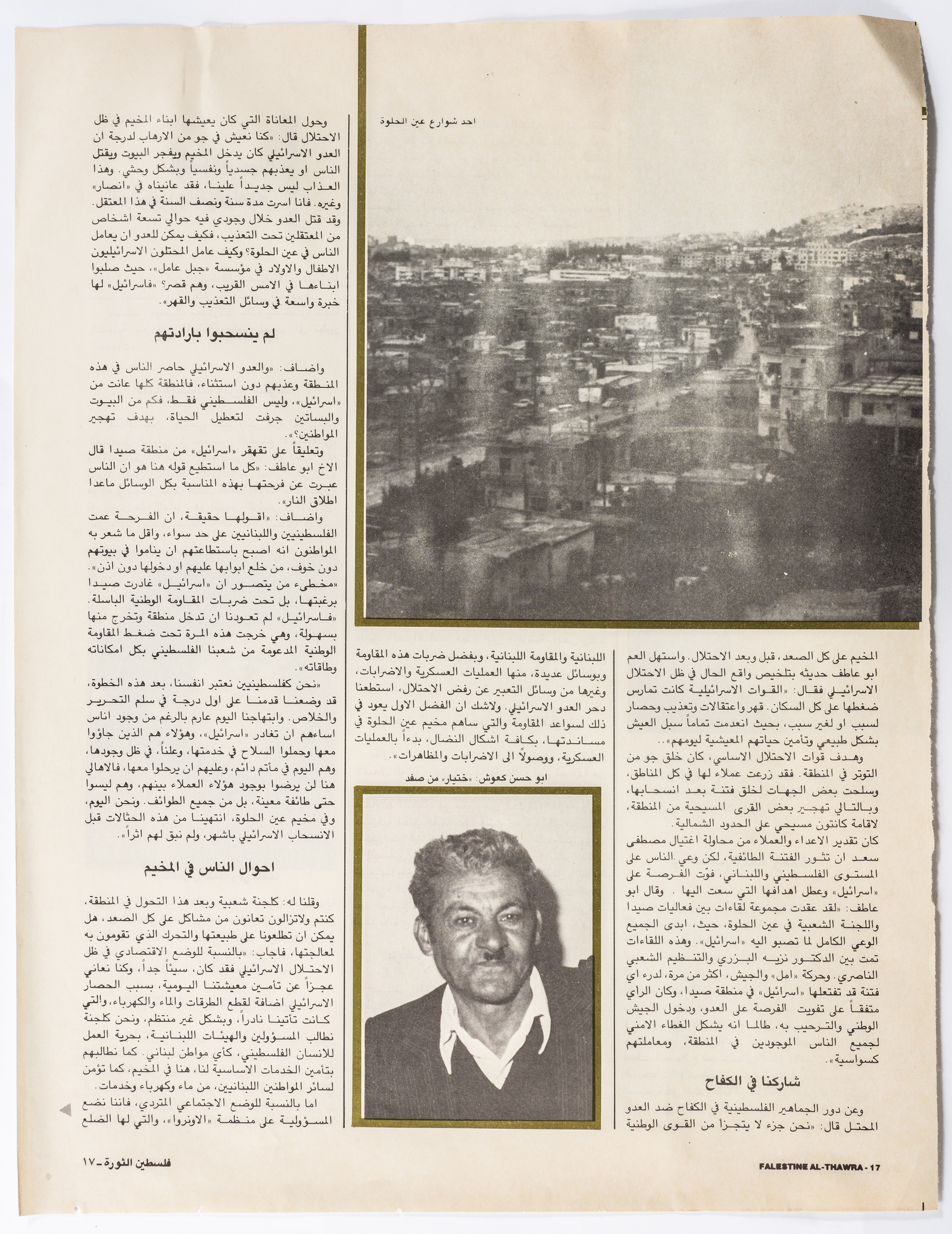 Issued in the 1980s, this document shows ten pages from an issue of Falastine ath-Thawra Newspaper, containing a report titled "Wars Do Not Break the Palestinian" on the Israeli Occupation Forces' withdrawal from the city of Sidon and the surrounding Palestinian camps in addition to an article titled "Peres and Rabin: The Butchers of Maarakeh" on the detonation of the husayniyya of the Maarakeh town in South Lebanon on 4 March 1985.