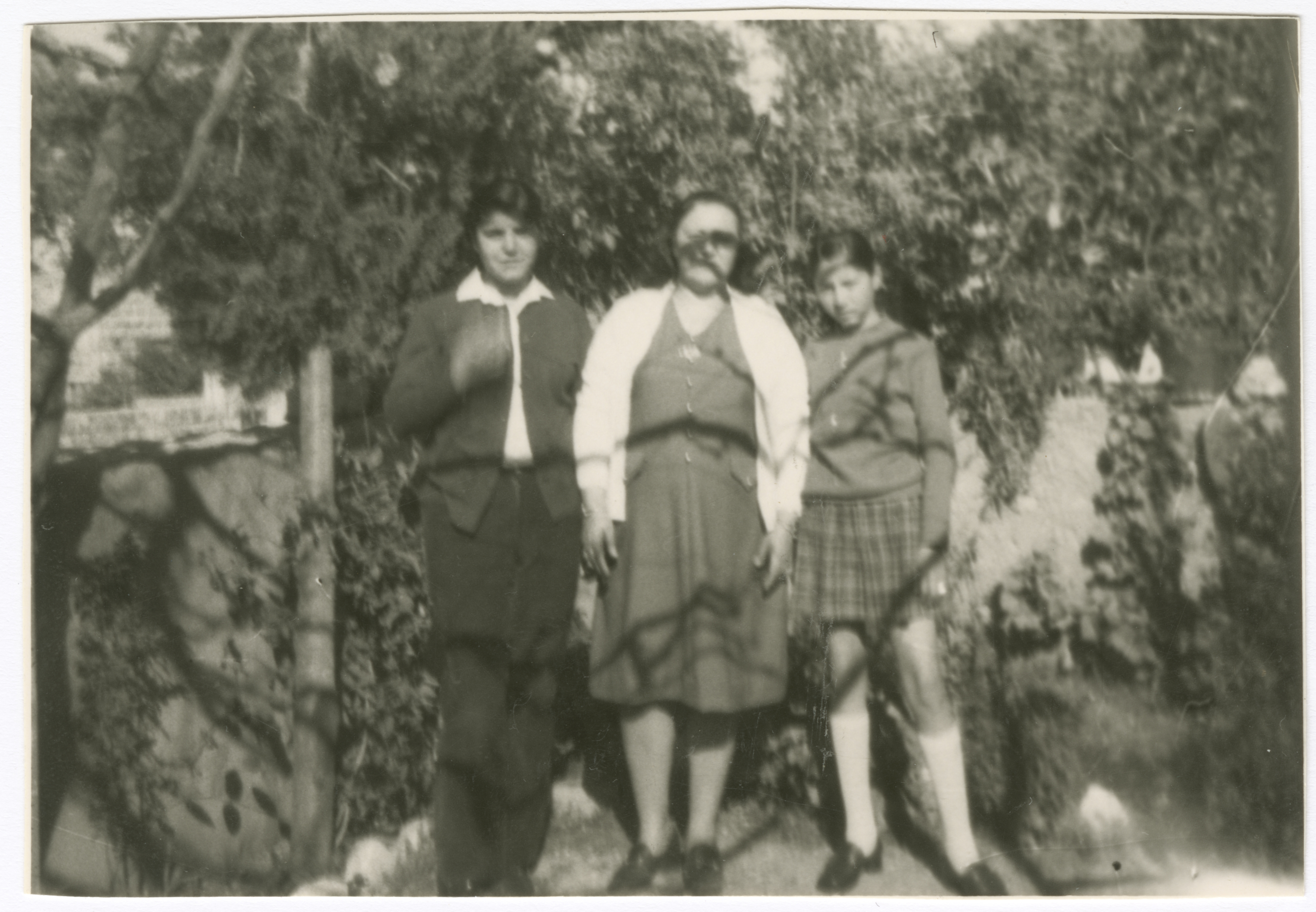 صورة لفاطمة الشلبي (والدة عمر القاسم) تتوسط بناتها آمال من اليمين وحنان من اليسار، التُقطت داخل حديقة منزلهم في الشيخ جراح ما بين 1968-1969.