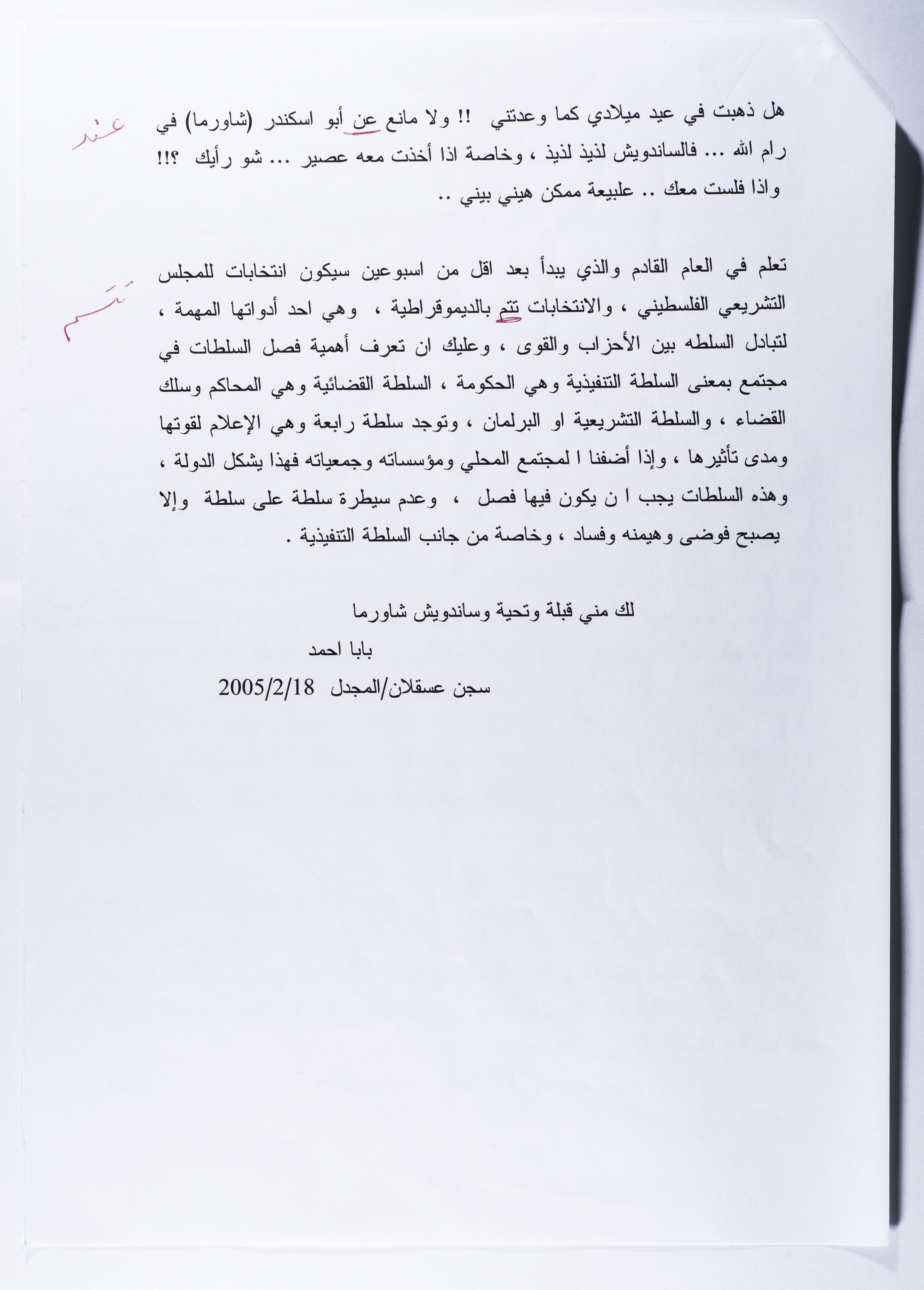 Printed in Arabic on February 18th, 2005 in Askalan Central Prison, this document features a letter from Ahmad al-Maslamani to his son Basel in which he advises him to be an active member of the society.