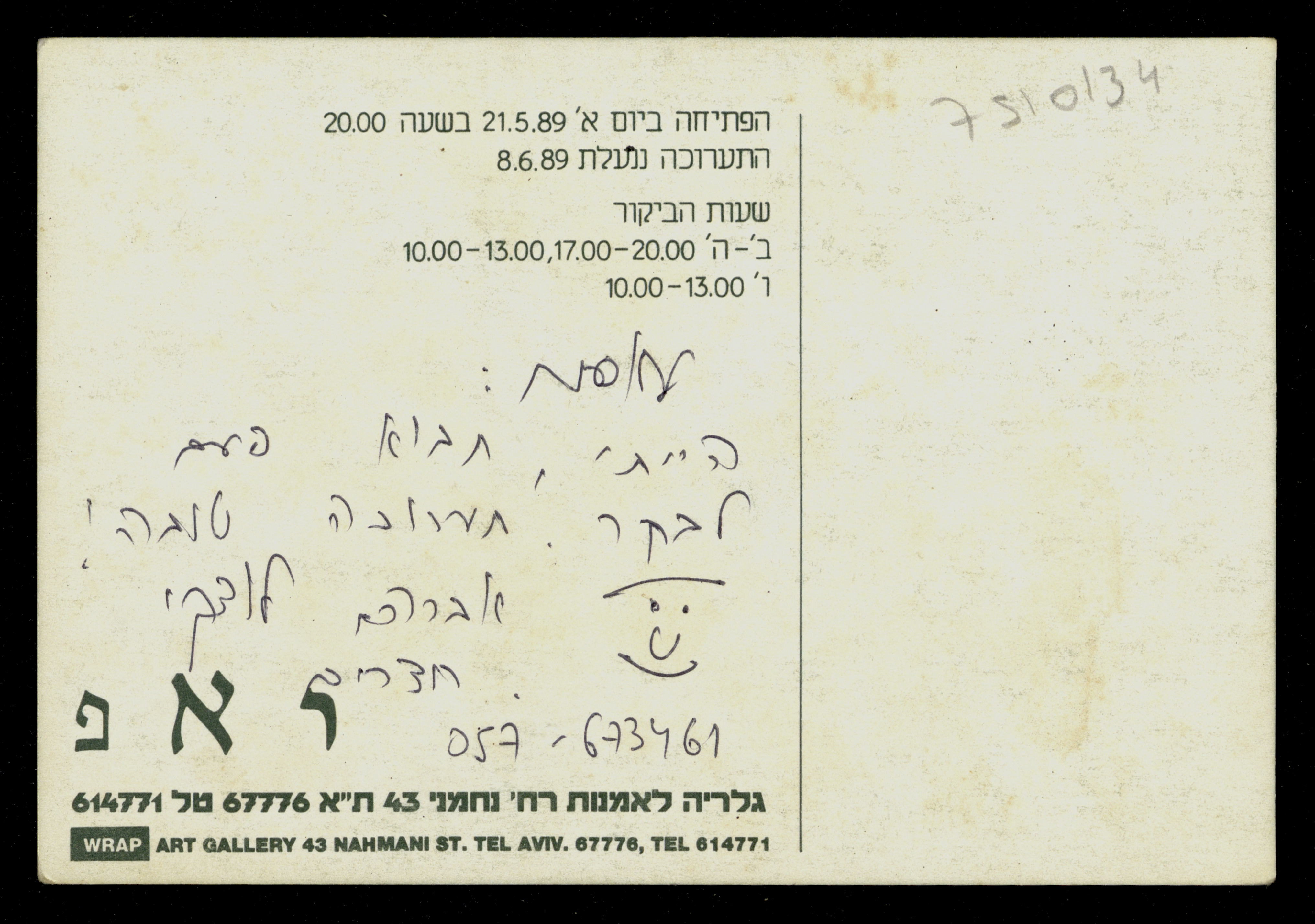 بطاقة دعائية لمعرض فني أُقيم في غاليري اسرائيلي يدعى "راب" في "تل أبيب"
