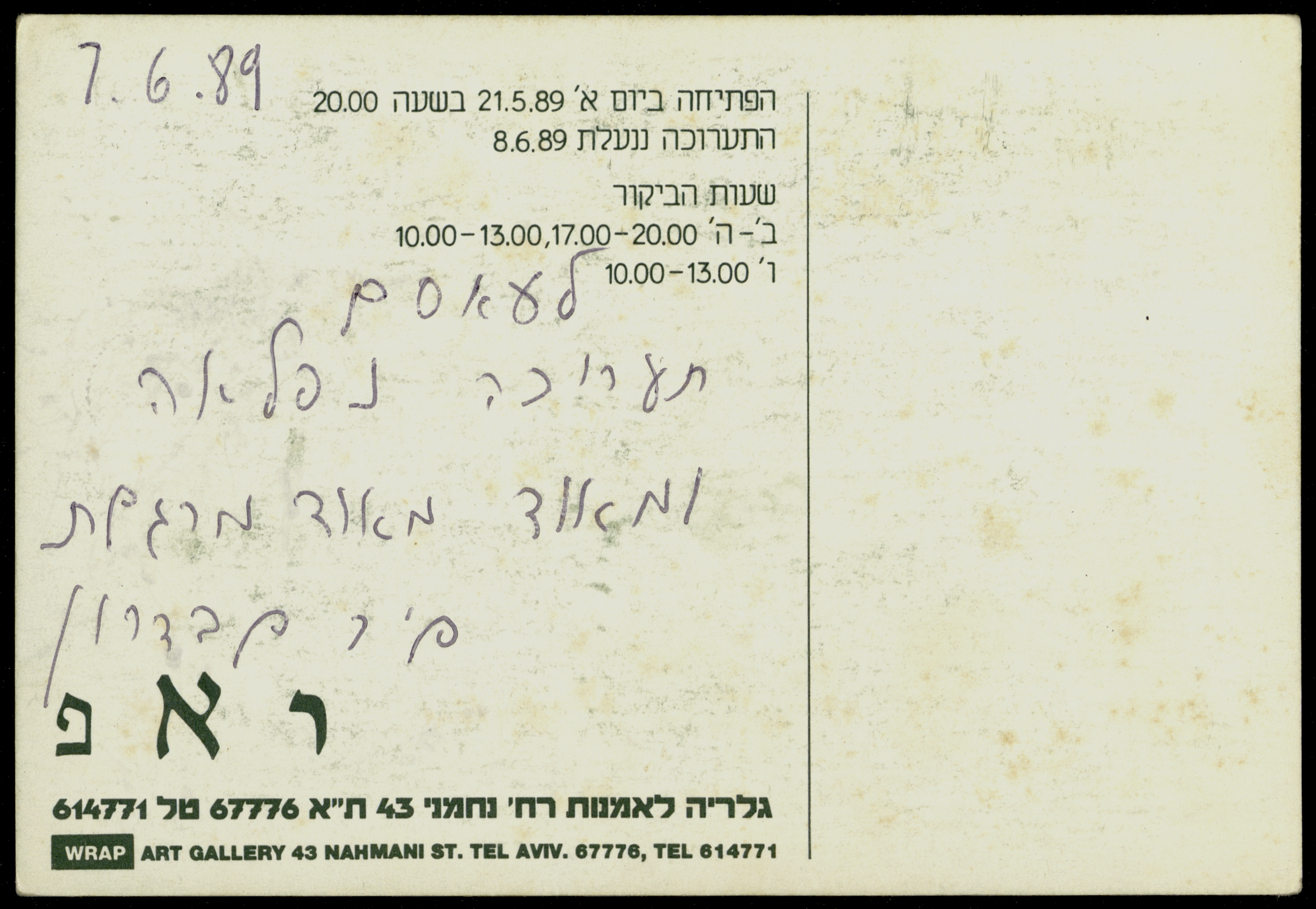 بطاقة دعائية لمعرض فني أُقيم في غاليري اسرائيلي يدعى "راب" في "تل أبيب"