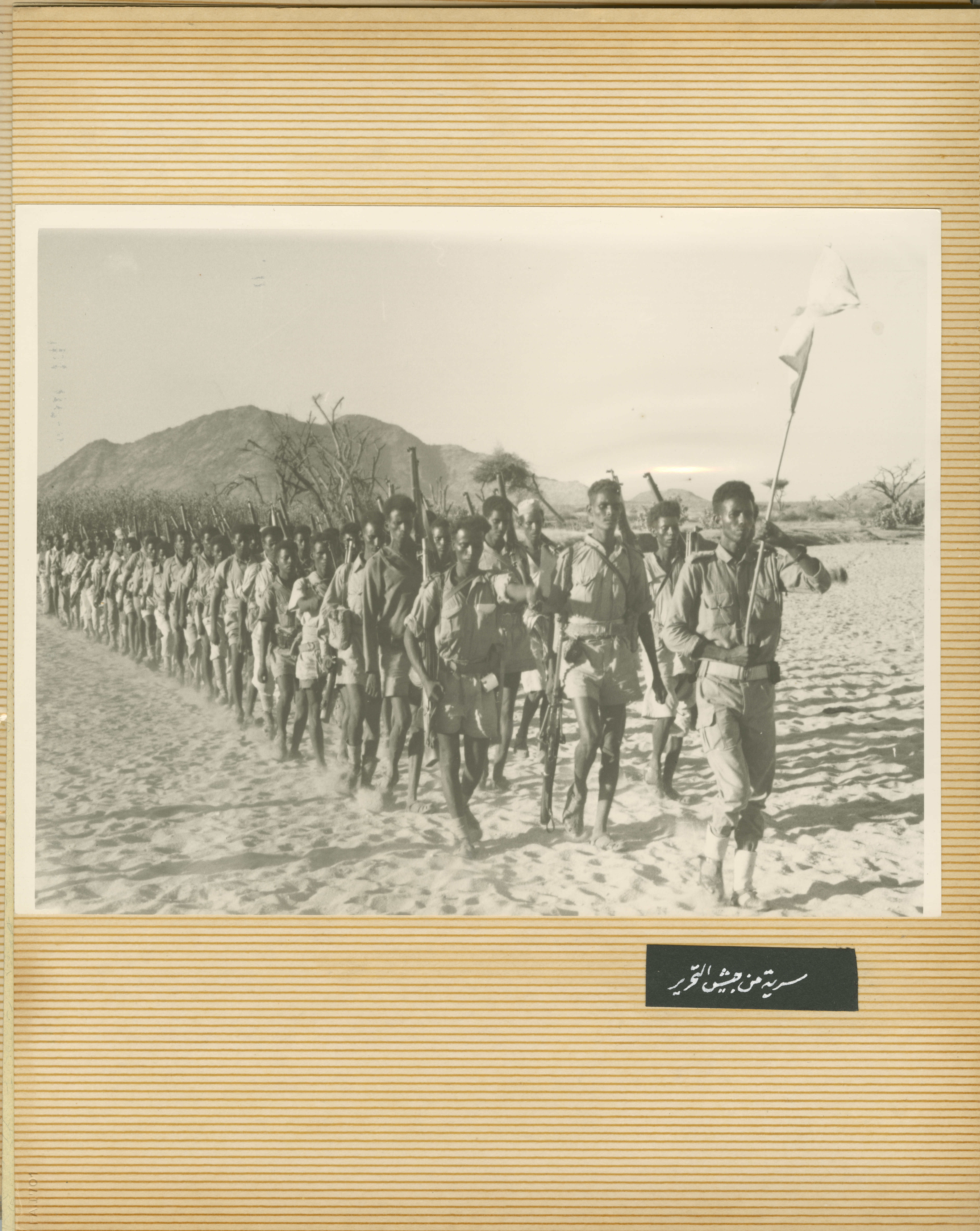 Taken during the period from 1961 to 1993, this photograph shows a brigade of the Liberation Army and was gifted by the Eritrean People's Liberation Front to Yasser Amro.