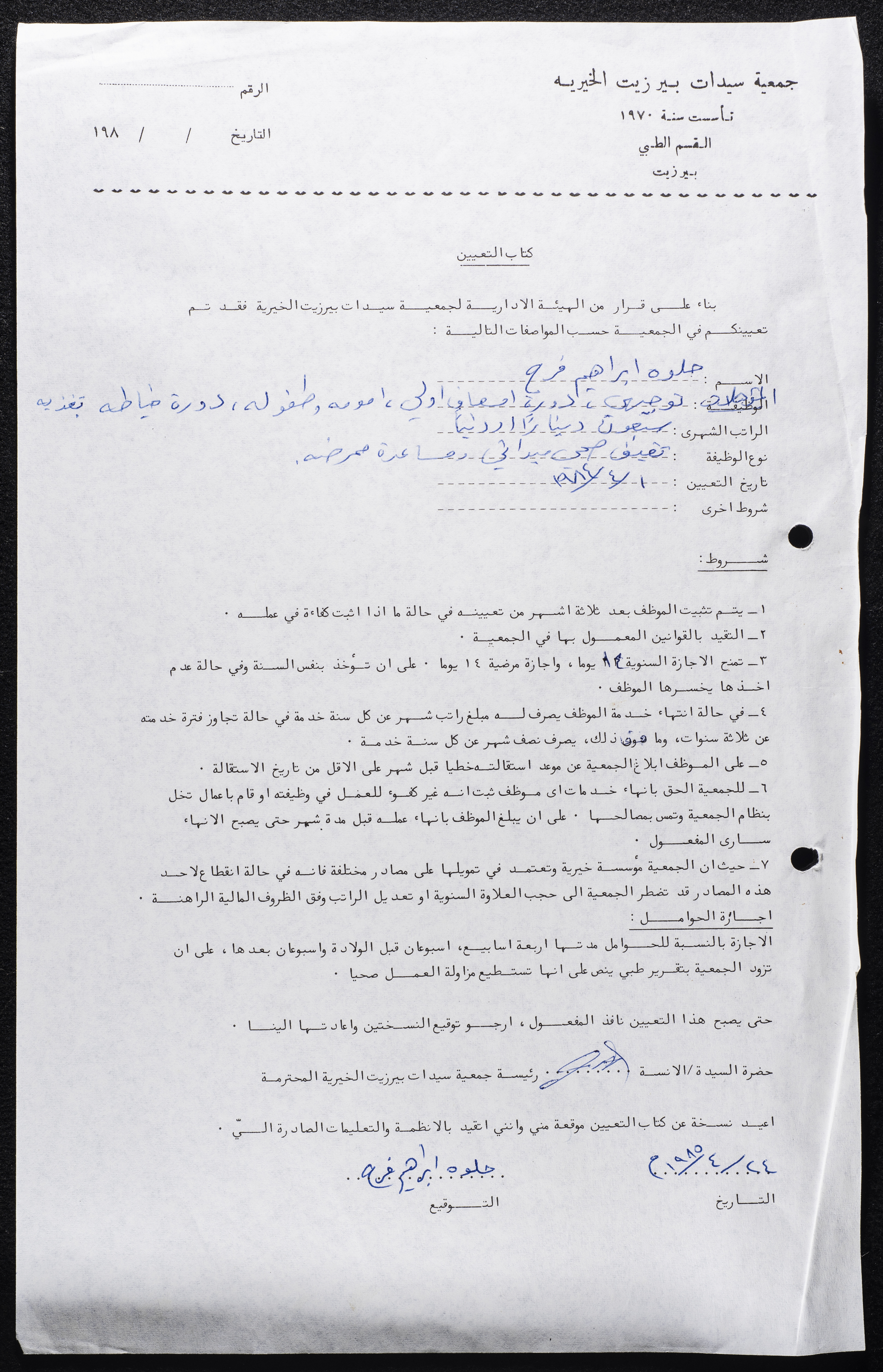Found in the Birzeit Women Charitable Society Collection, this document shows a letter of appointment from the Medical Department at Birzeit Women Charitable Society, 1 April 1984.