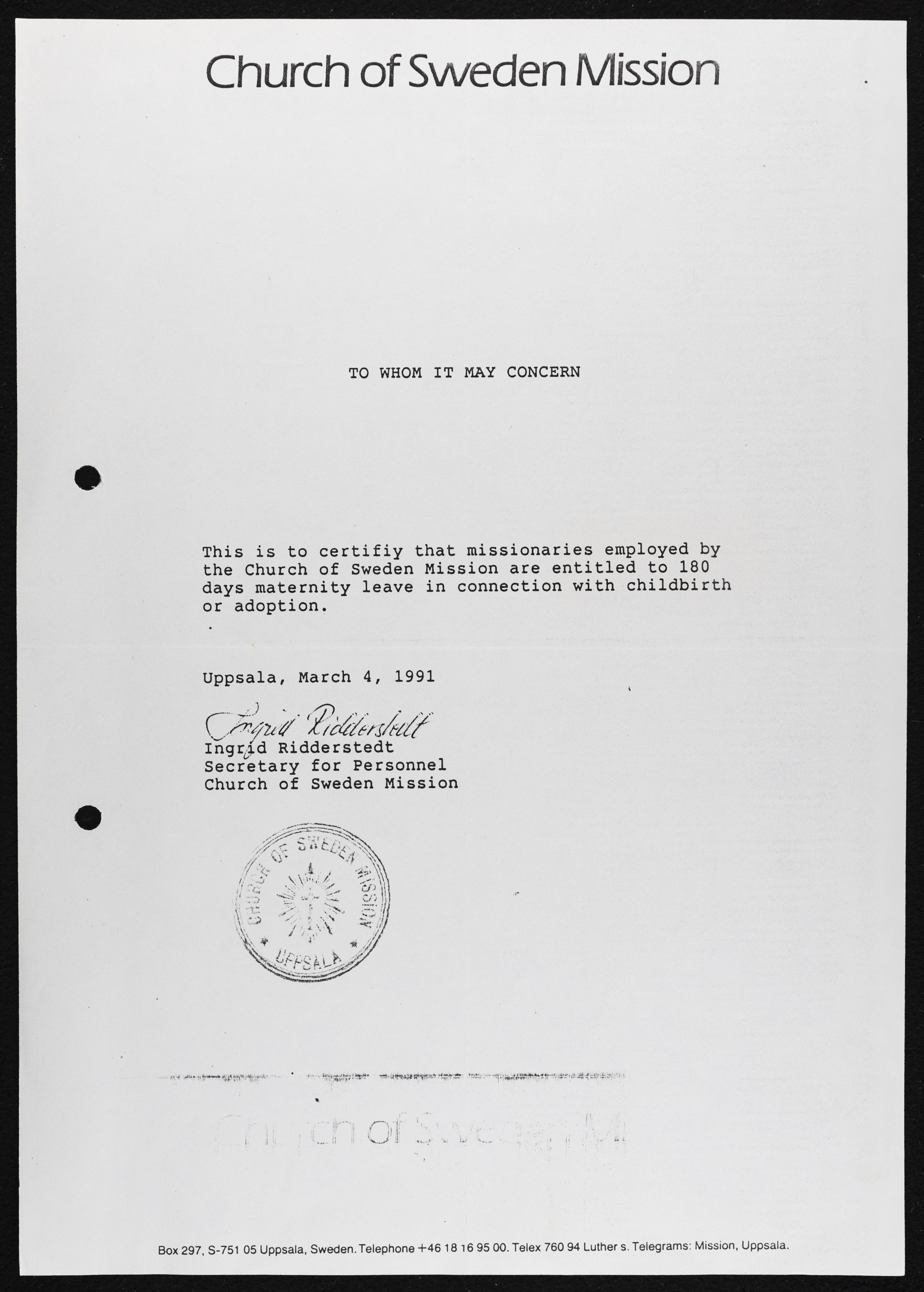 A Letter from the Church of Sweden Mission, 4 March 1991
