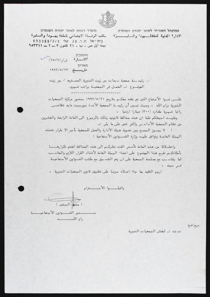 Found in the Birzeit Women Charitable Society Collection, this document shows a letter from the Judea and Samaria Social Welfare Office to Birzeit Women Charitable Society, 23 May 1992.