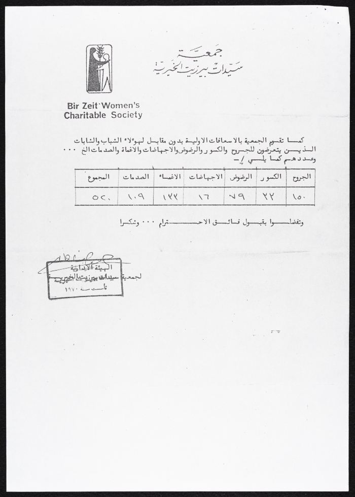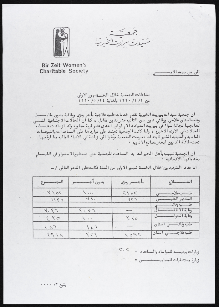 Found in the Birzeit Women's Charitable Society Collection, this printed donation request letter in Arabic was issued by the Administrative Board of Birzeit Women's Charitable Society. The letter details the Society's activities from January 1 to May 24, 1990.
