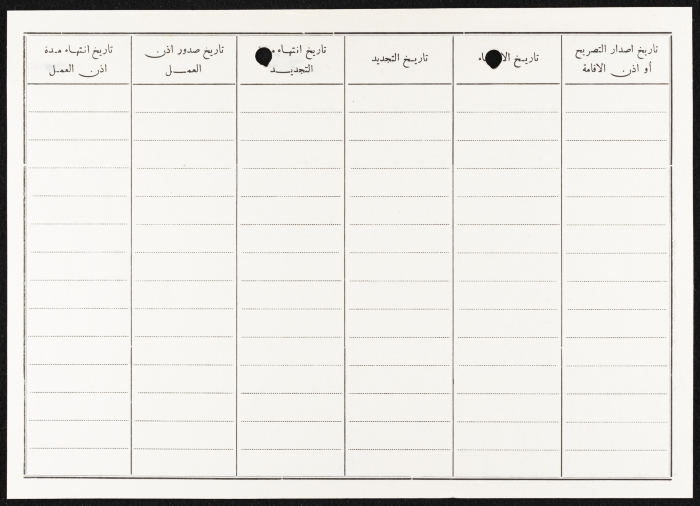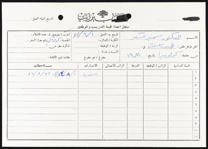 Found in the Birzeit Women's Charitable Society Collection, this printed document is a log used to keep track of the employees and teaching staff at Birtzeit University. The word "university" is crossed out so the log can be used by Birzeit Women's Charitable Society to document the employment of Dr Samir Askar in 1983.