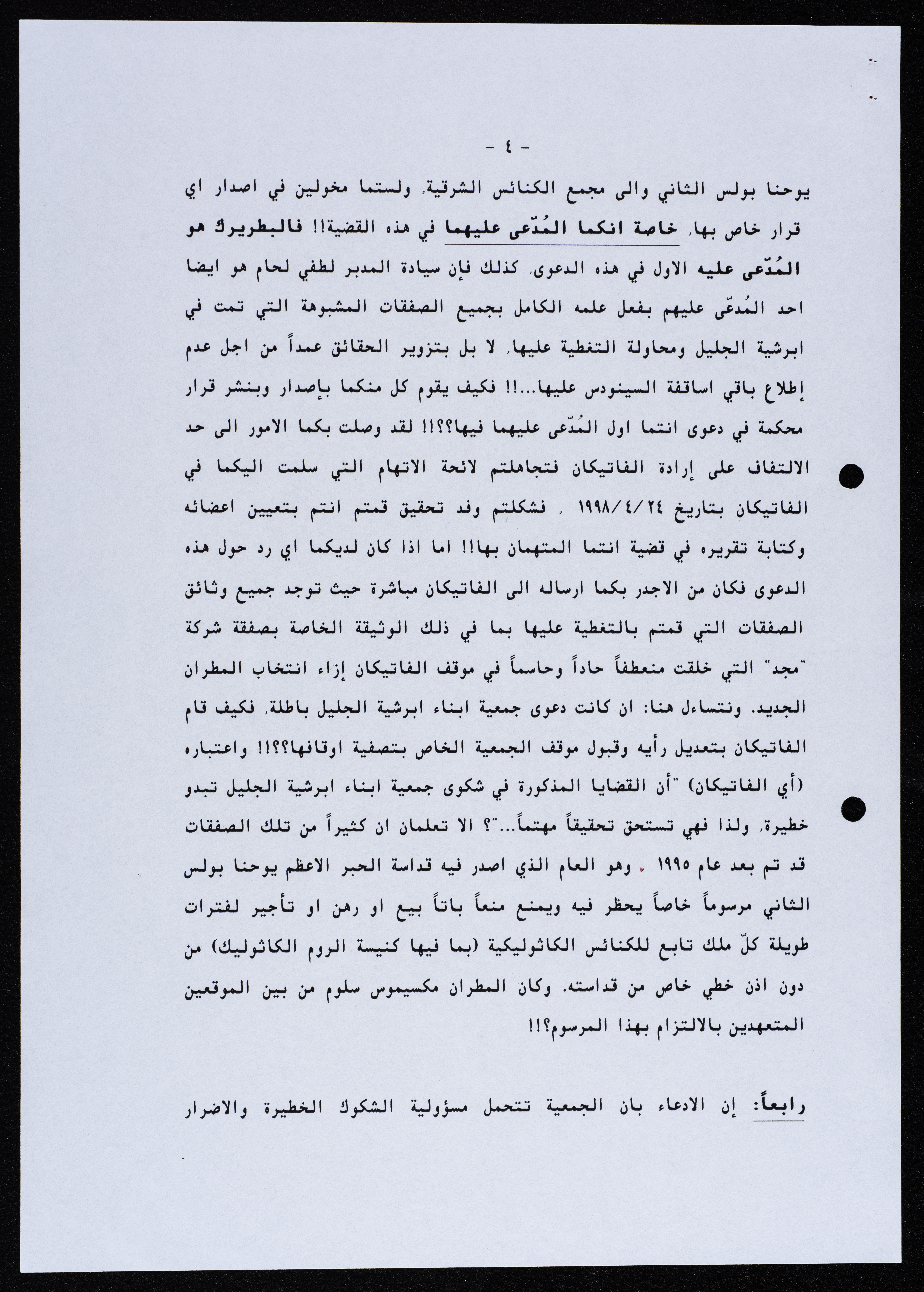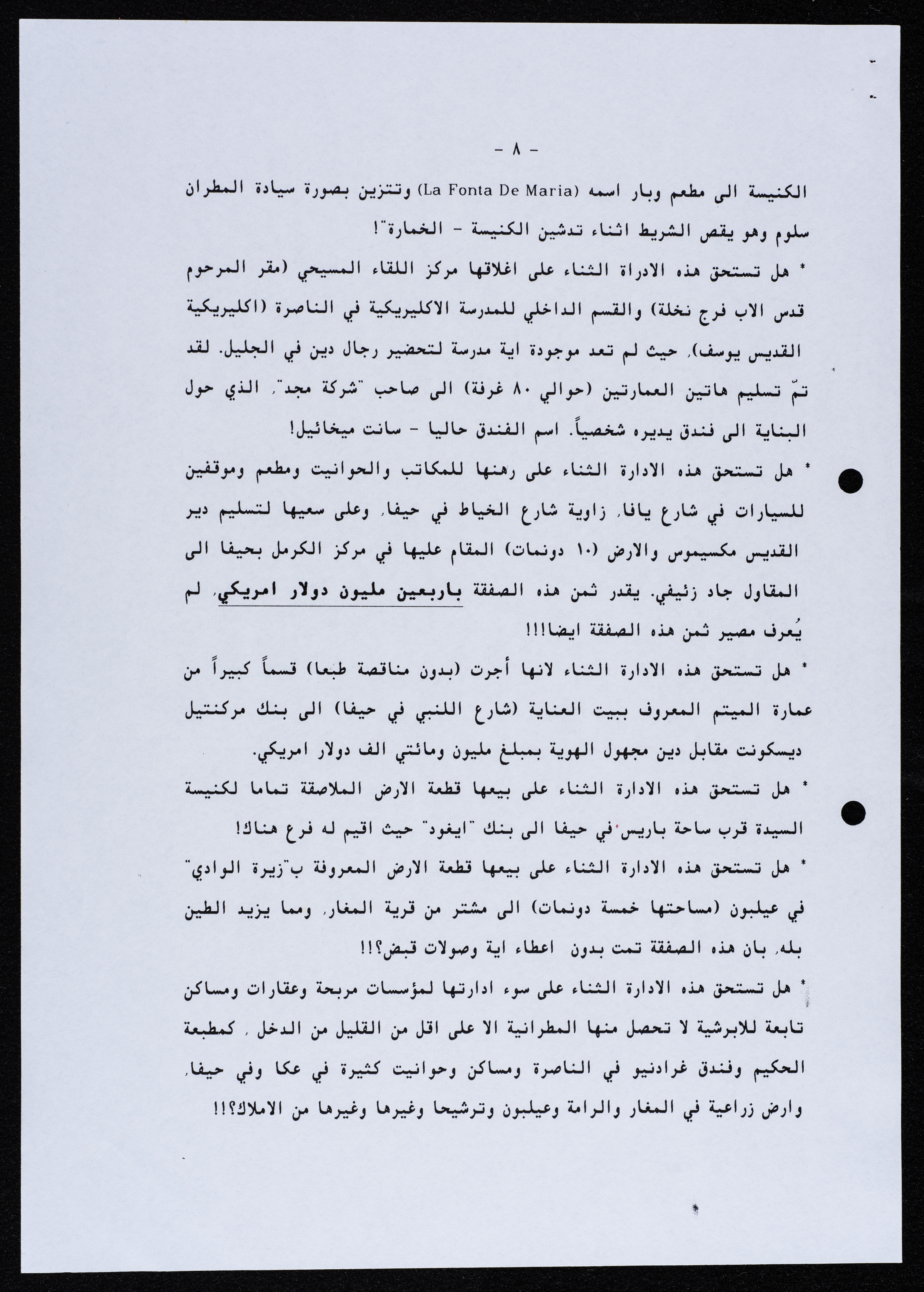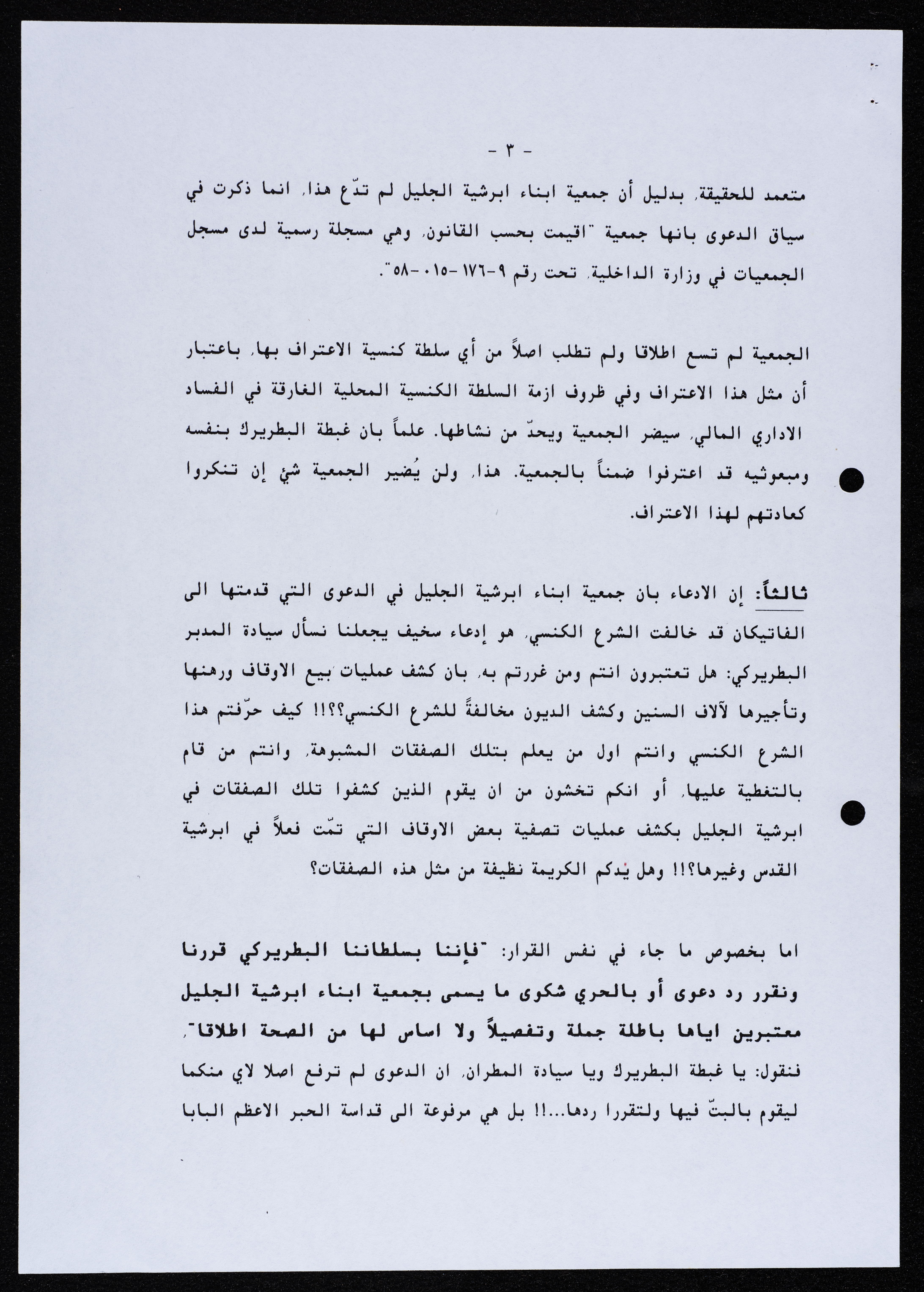 A statement issued by the Diocese of Galilee Members Association in response to the statement of the Patriarchal Chairperson of the Diocese of Acre, Haifa, Nazareth and the Galilee, Bishop Lotfi Lahham, 1998.