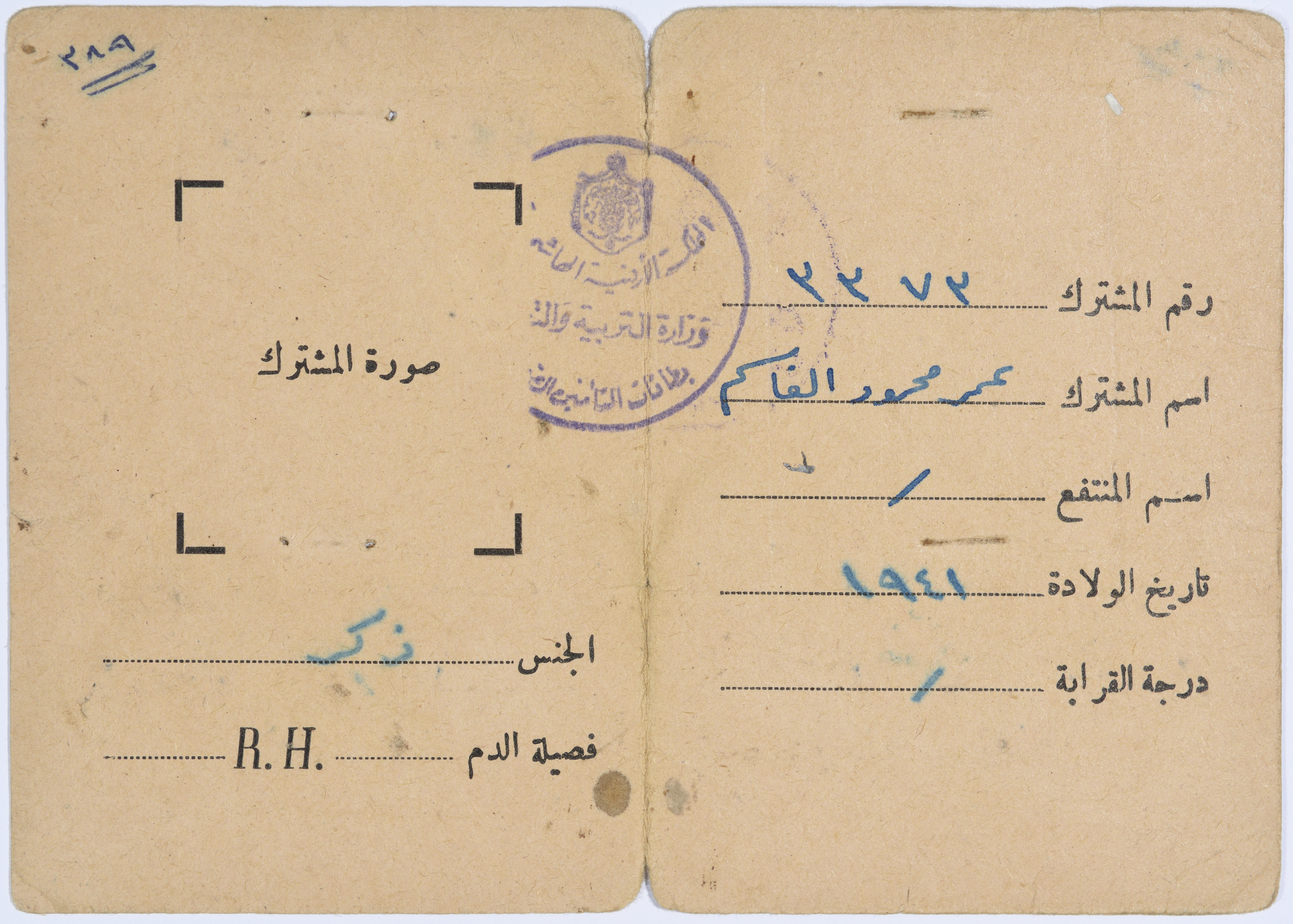بطاقة تأمين صحي لعمر القاسم صادرة عن وزارة الصحة في المملكة الأردنية الهاشمية بتاريخ 14 أيار 1966.