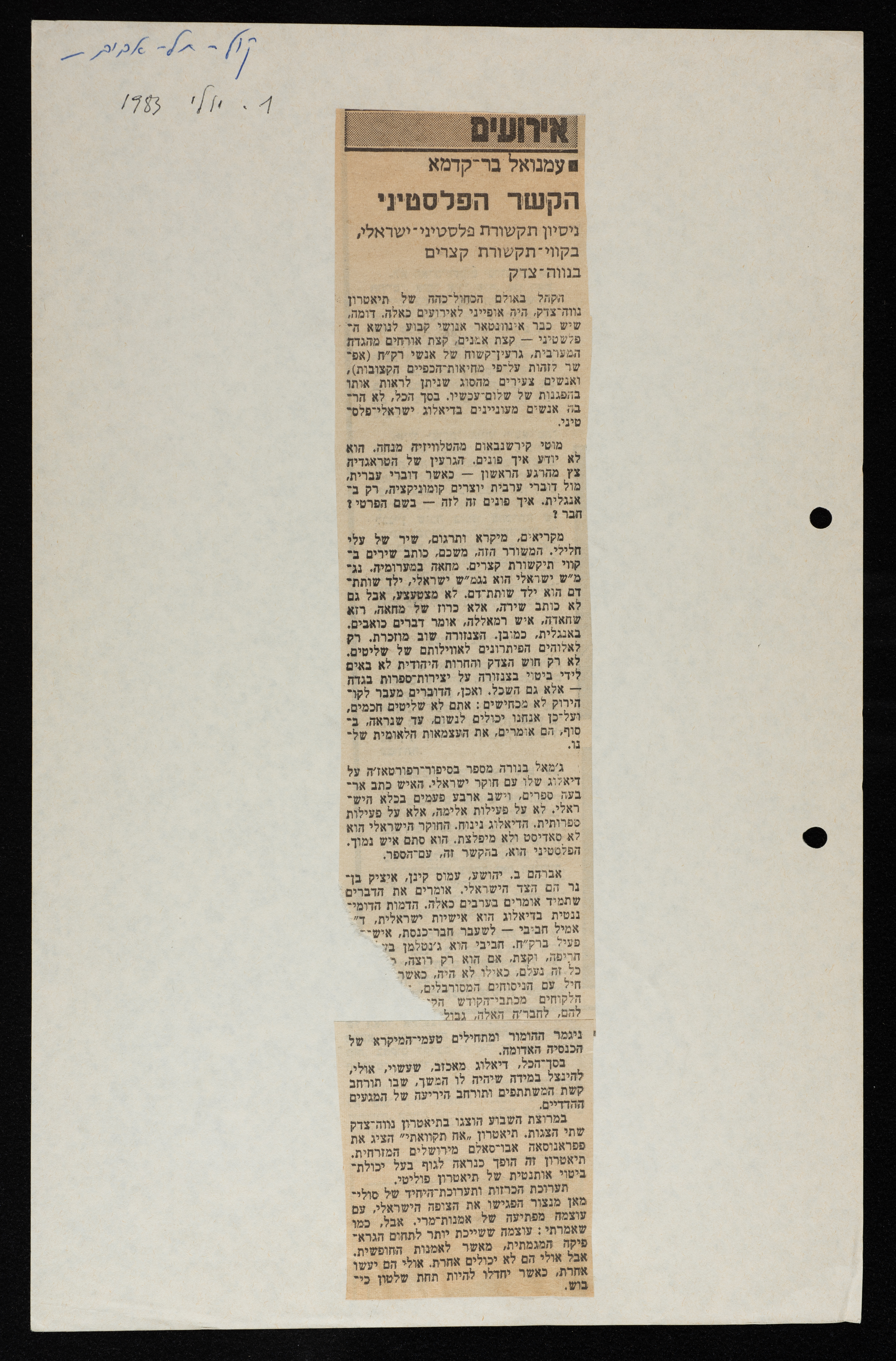 Dated July 1, 1983, this clipping from the Hebrew newspaper Kol Tel Aviv is a report on El-Hakawati Theatre and the communication between Palestinians and Israelis.