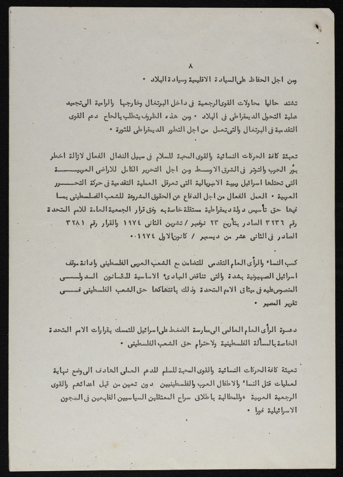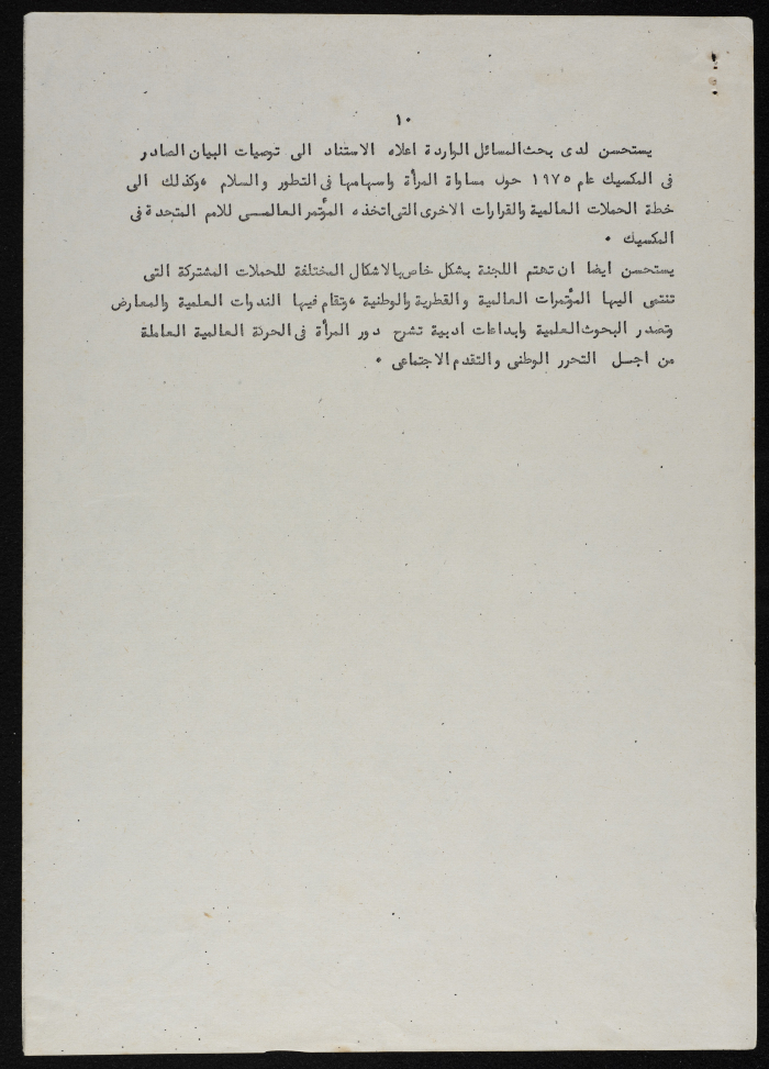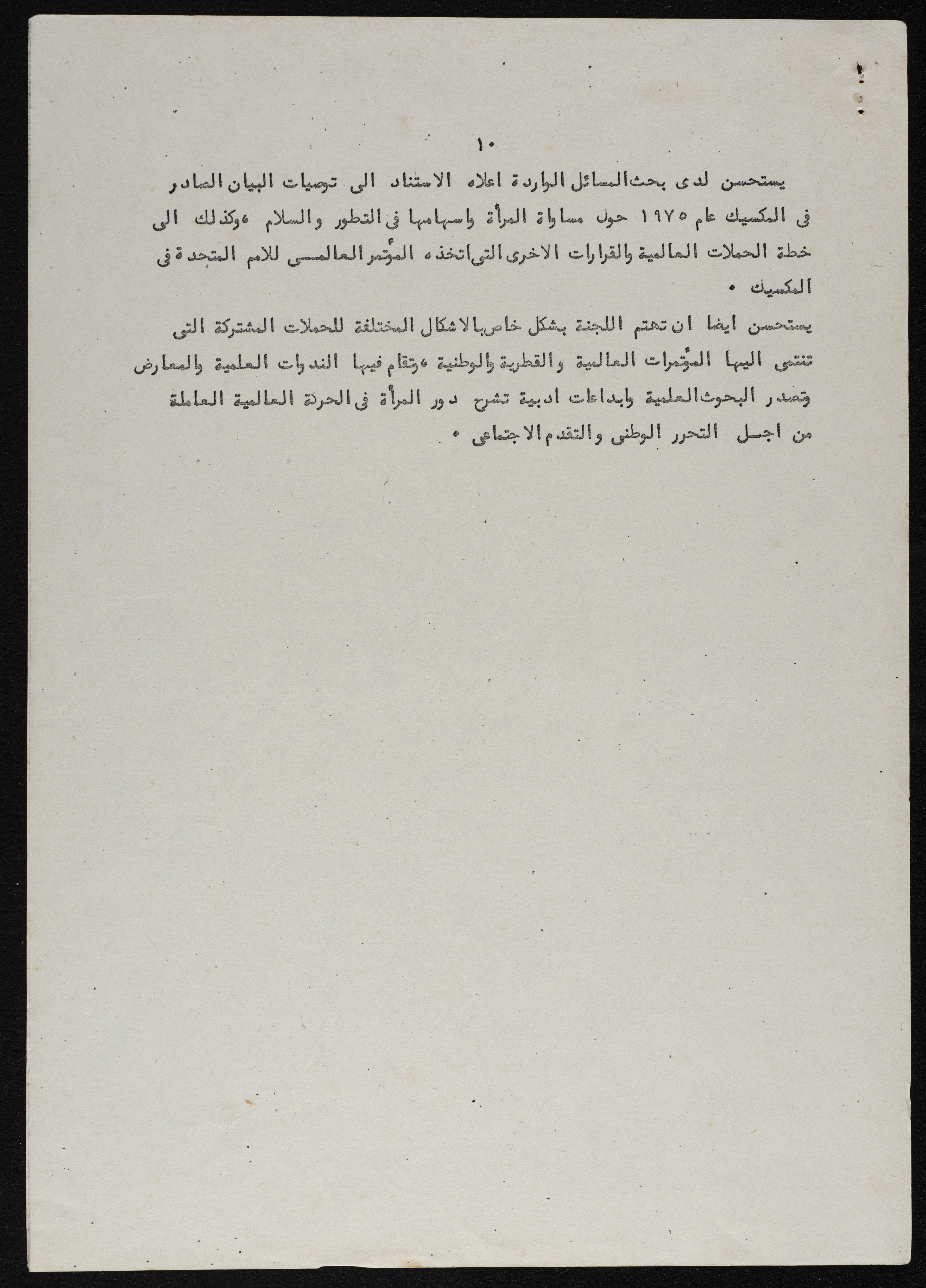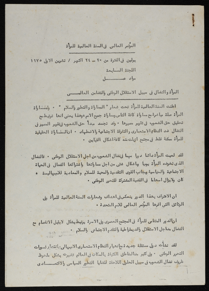 Printed in Arabic, this document shows an article entitled "The International Conference of the International Women's Year", which was held in Berlin in 1975.