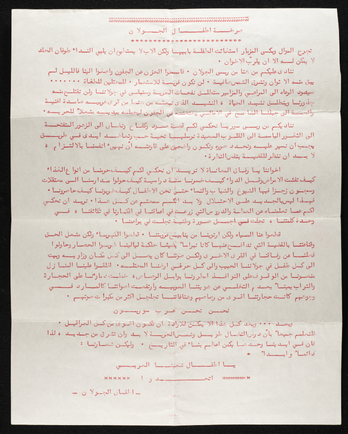 Printed in Arabic, this document shows a call entitled "The Scream of Children from Golan".