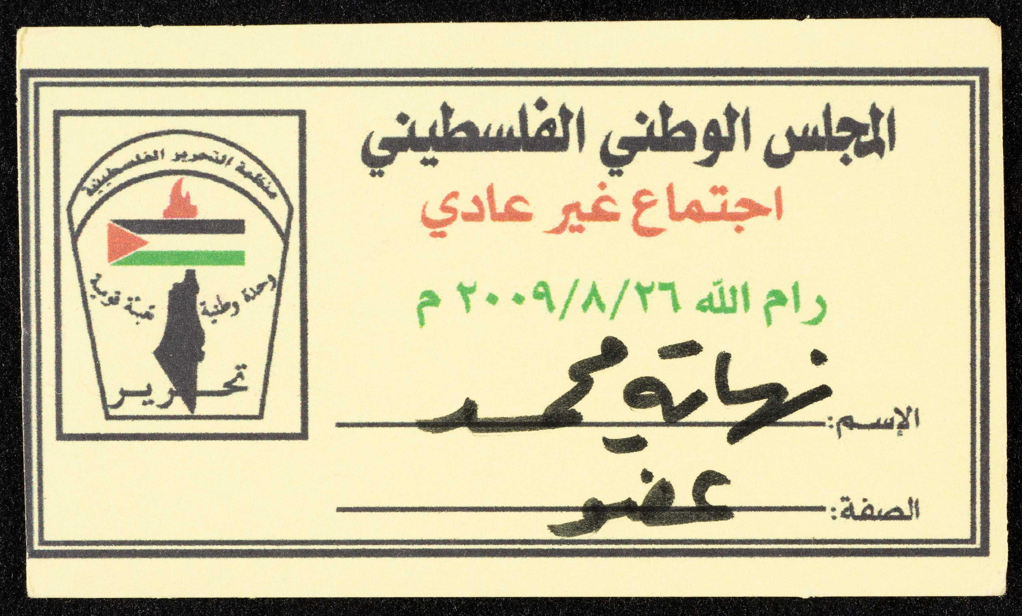 بطاقة مشاركة بصفة "عضو" في اجتماع غير عادي للمجلس الوطني الفلسطيني، 2009