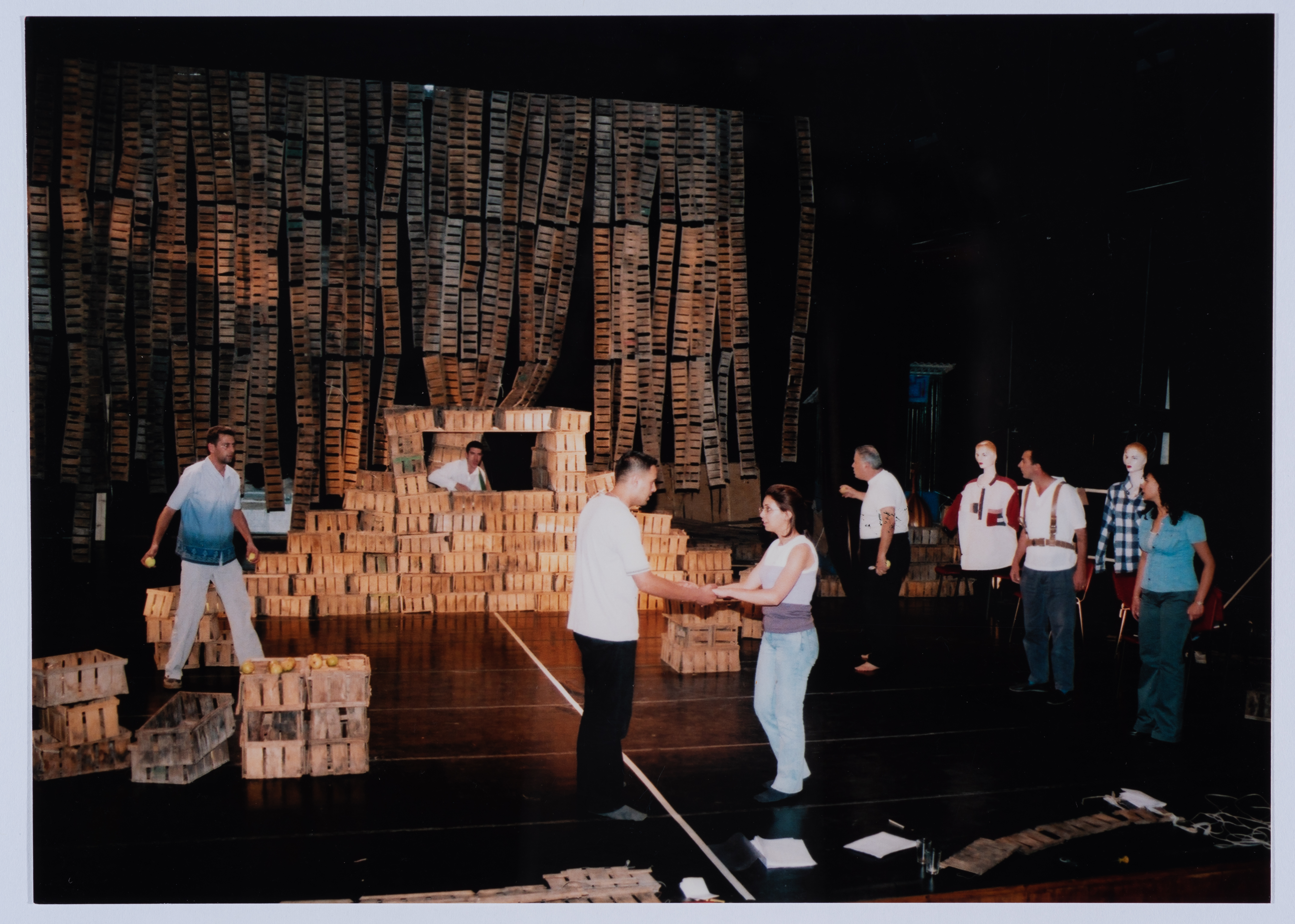 Taken in 1986 at al-Kasaba Theatre and Cinematheque, this colour photograph captures a freeze of David Greg's play "It is not About a Rummaneh". Translated into Arabic by George Ibrahim and directed by Rufus Norris, the play featured a cast of actors, including Khalifa Natur, Mahmud 'awad, Kamel al-Basha, Husam abu ʿeisheh, Georgina ʿaṣfur, ʿimad Farrajin, Manal 'awad, Nizar Zu’oby, Ibrahim ʿlayut, and Samer abu ʿeisheh. Jamil as-Sayeh composed the background music. The play was performed only once due to the outbreak of the First Intifada.