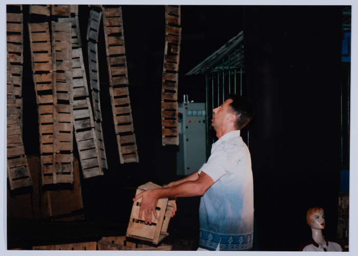 Taken in 1986 at al-Kasaba Theatre and Cinematheque, this colour photograph captures a freeze of David Greg's play "It is not About a Rummaneh". Translated into Arabic by George Ibrahim and directed by Rufus Norris, the play featured a cast of actors, including Khalifa Natur, Mahmud 'awad, Kamel al-Basha, Husam abu ʿeisheh, Georgina ʿaṣfur, ʿimad Farrajin, Manal 'awad, Nizar Zu’oby, Ibrahim ʿlayut, and Samer abu ʿeisheh. Jamil as-Sayeh composed the background music. The play was performed only once due to the outbreak of the First Intifada.