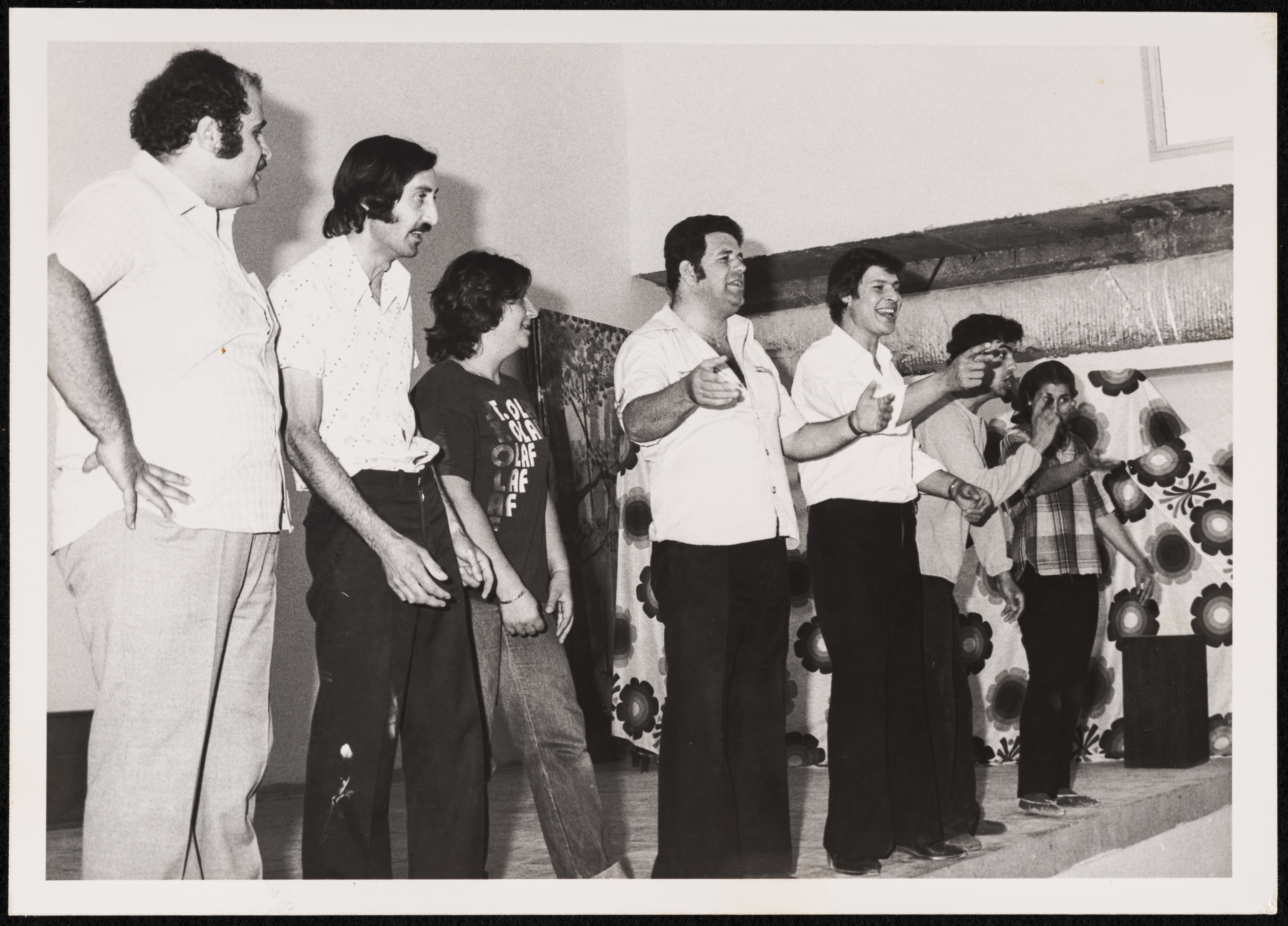 صورة ترصد لقطة من مسرحية "ليلى الحمراء" على خشبة مسرح وسينماتك القصبة عام 1975. المسرحية من تأليف وإخراج جورج إبراهيم وتمثيله إلى جانب بسام زعمط، وجاكي أيوب، وجمال إسعيد، وعدلي حمودة، وصقر سلايمه، ومحمود عوض.