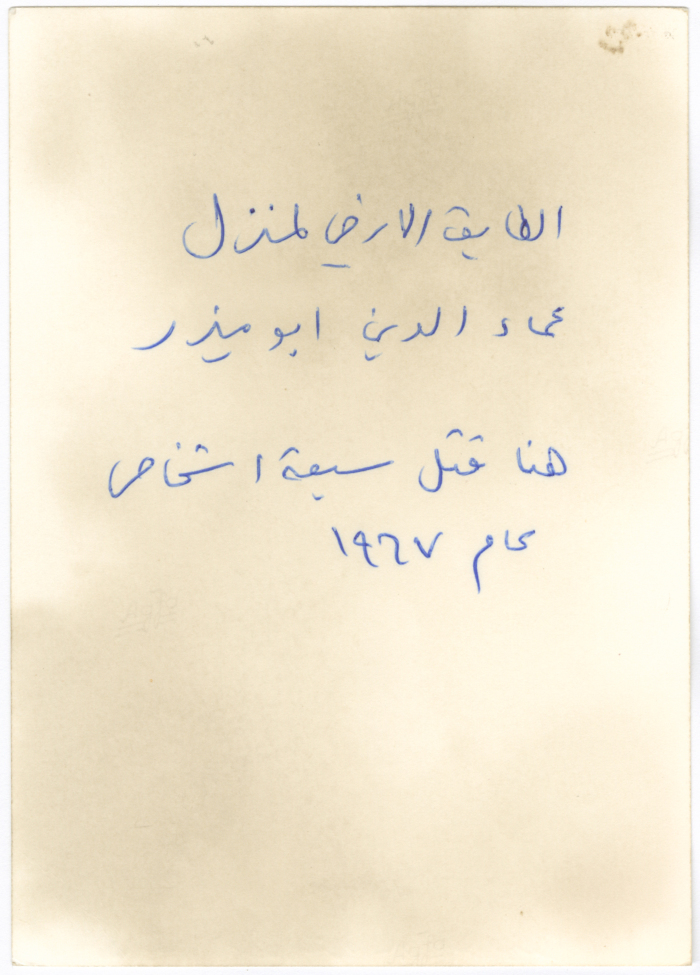 Found in Musa Allush's collection, this monochromatic photograph shows the ground floor of Imad ad-Din abu Maizar's house in the old Bab Hutta Street, Jerusalem; seven individual were killed in this house in 1967.