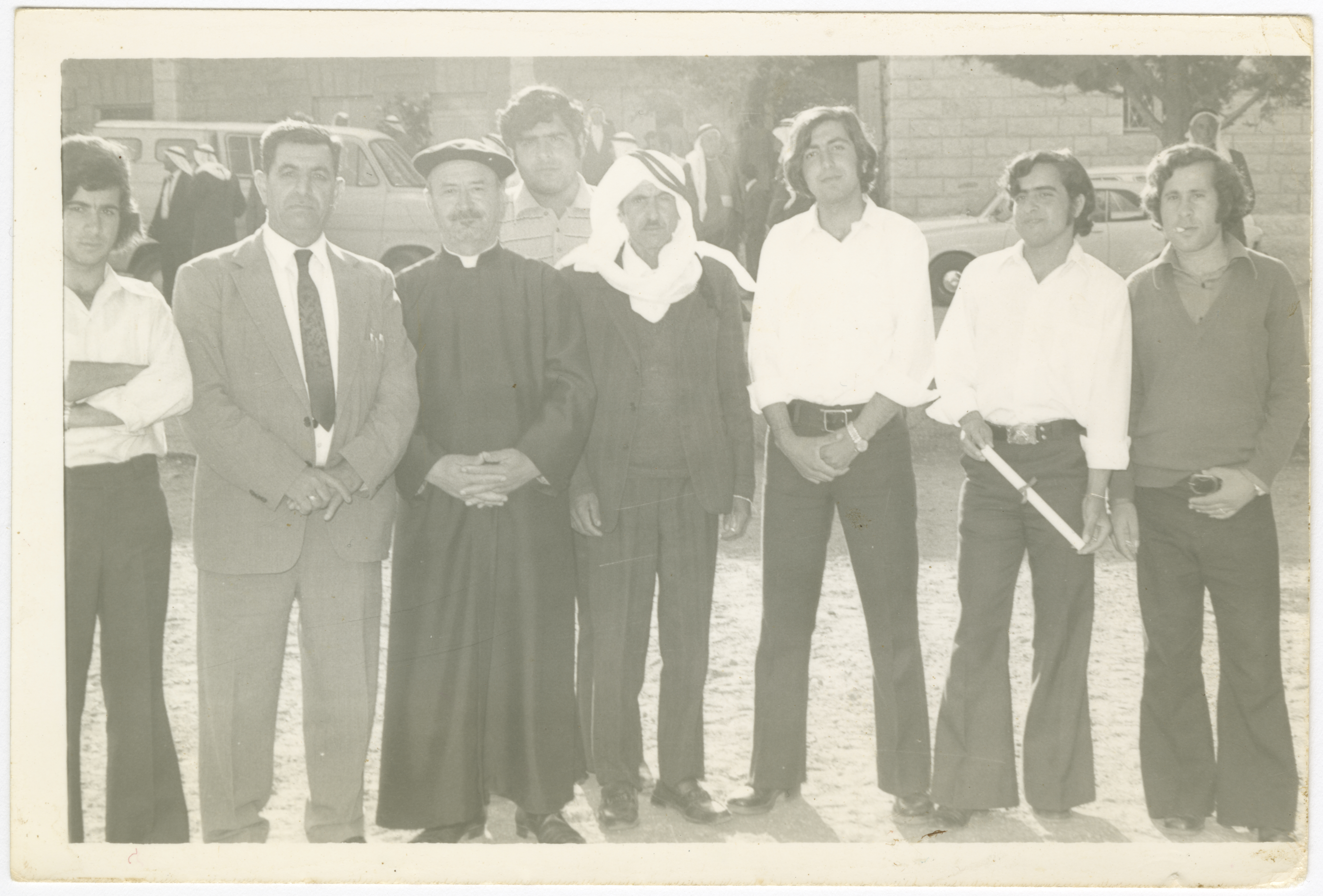 حفل تخريج ناظم نعمة من بلدة الطيبة وهو في مدرسة عين يبرود. (من اليمين): غير معروف، ناظم نعمة، صالح جابر، عبد ناظم نعمة، الخوري سيلفيو، جابر دبابنة، غير معروف)